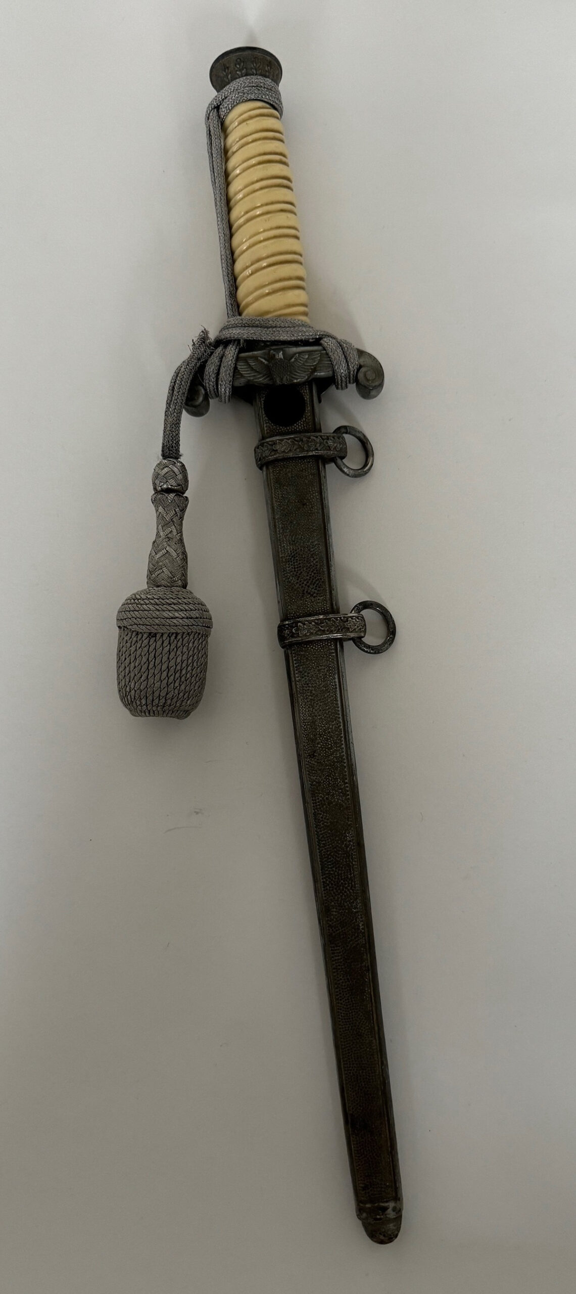 Sehr guter, nur minimal getragener Zustand. Der weiße(!) Griff ohne Fehler. Knauf und Parierstange aus Zink, in einen sehr guten Zustand, unbeschädigten Zustand. Mit noch sehr schöner Versilberung. Die Parierstange mit den Hoheitsadler in der sogenannten „Tomahawk“ Ausführung. Die Scheide aus versilberten Eisen, ohne Fehler. Mit unberührter Patina. Die Klinge blank und fehlerfrei. Darauf der Hersteller „WKC Solingen“ für die Firma Weyersberg, Kirschbaum & Cie, Solingen. Mit original gebundenen Portepee. Gesamtlänge ca. 40 cm, Klingenlänge ca. 26 cm.