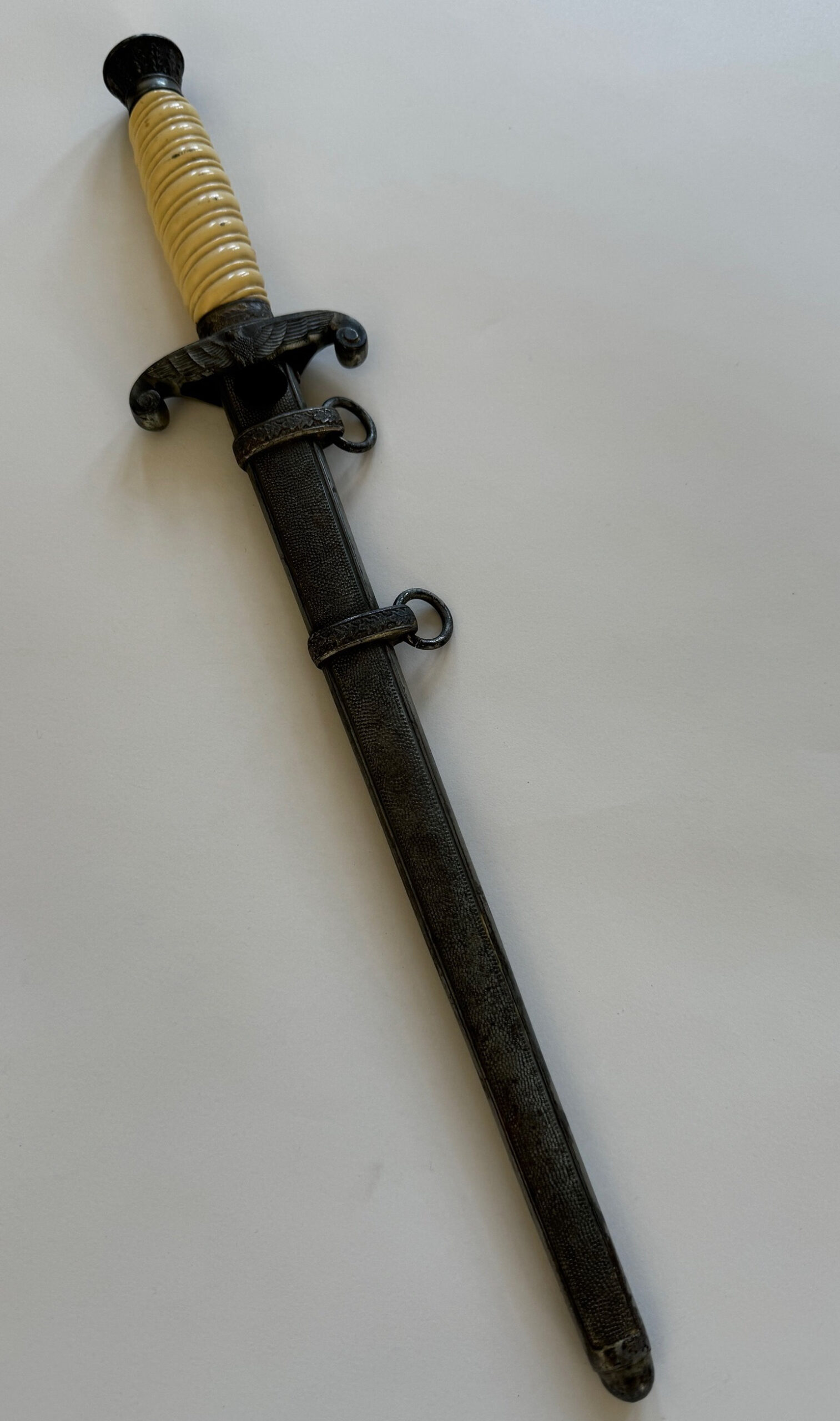 Sehr guter, nur minimal getragener Zustand. Der weiße Griff mit leichten Tragespuren, aber ohne Fehler. Die Eisen Scheide ohne Fehler, mit leichter Patina. Knauf und Parierstange aus versilberten Zink. Die Kline blank und unbeschädigt. Ohne Hersteller, aber eine bekannte Variante.