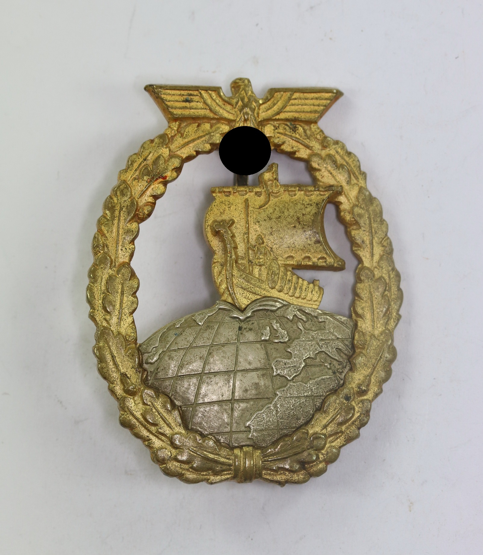 Buntmetall, sehr guter, nur minimal getragener Zustand. Mit vollständiger Vergoldung, die Weltkugel mit vollständiger Versilberung. Mit leichten Ansätzen von Patina. Die Weltkugel separat aufgesetzt. Ohne Hersteller, aber eine bekannte Variante der Firma C.E. Juncker, Berlin. Siehe GCA-Datenbank.