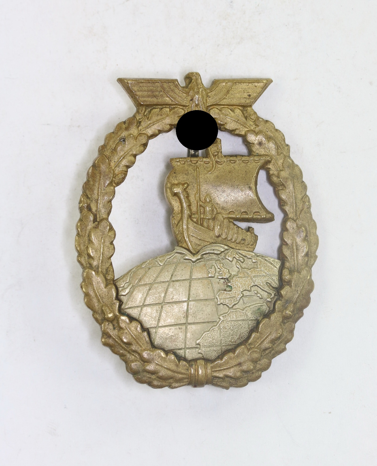 Buntmetall, sehr guter, leicht getragener Zustand. Mit sehr schöner Vergoldung. Die Weltkugel separat aufgesetzt. Ohne Hersteller, aber eine bekannte Variante der Firma C.E. Juncker, Berlin. Siehe GCA-Datenbank.