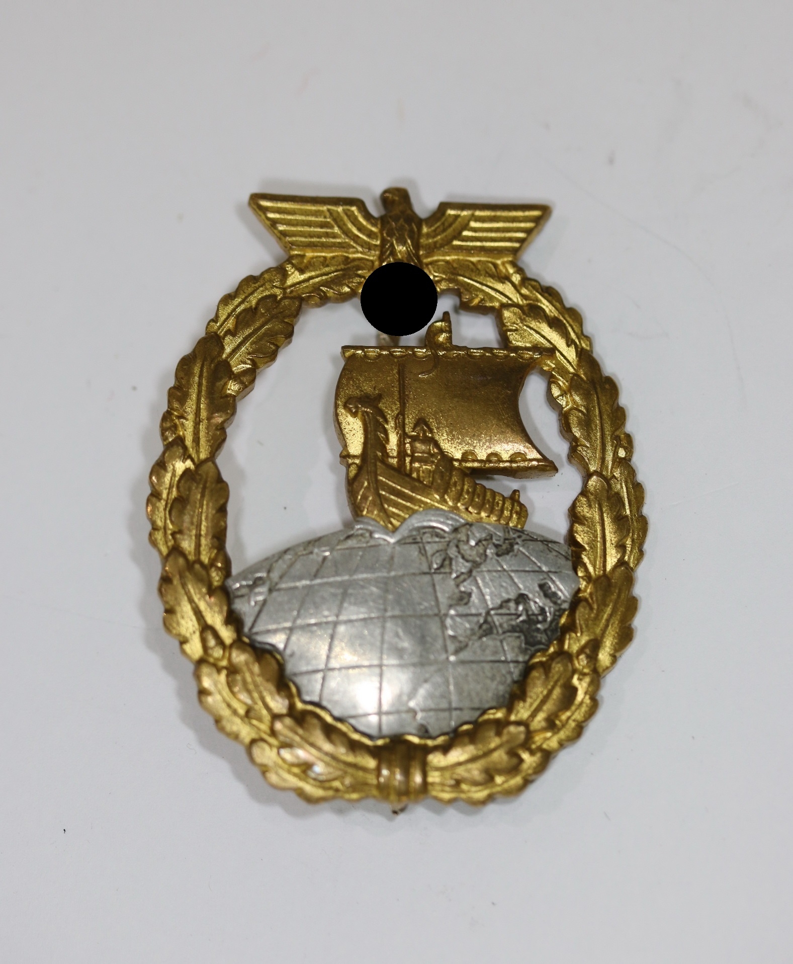 Buntmetall, sehr guter, minimal getragener Zustand. Mit fast vollständiger, strahlender Vergoldung. Der Aluminium Globus separat aufgenietet. Mit Hersteller „Schwerin Berlin“. Siehe Weber/Skora, Die Kriegsabzeichen der Kriegsmarine.