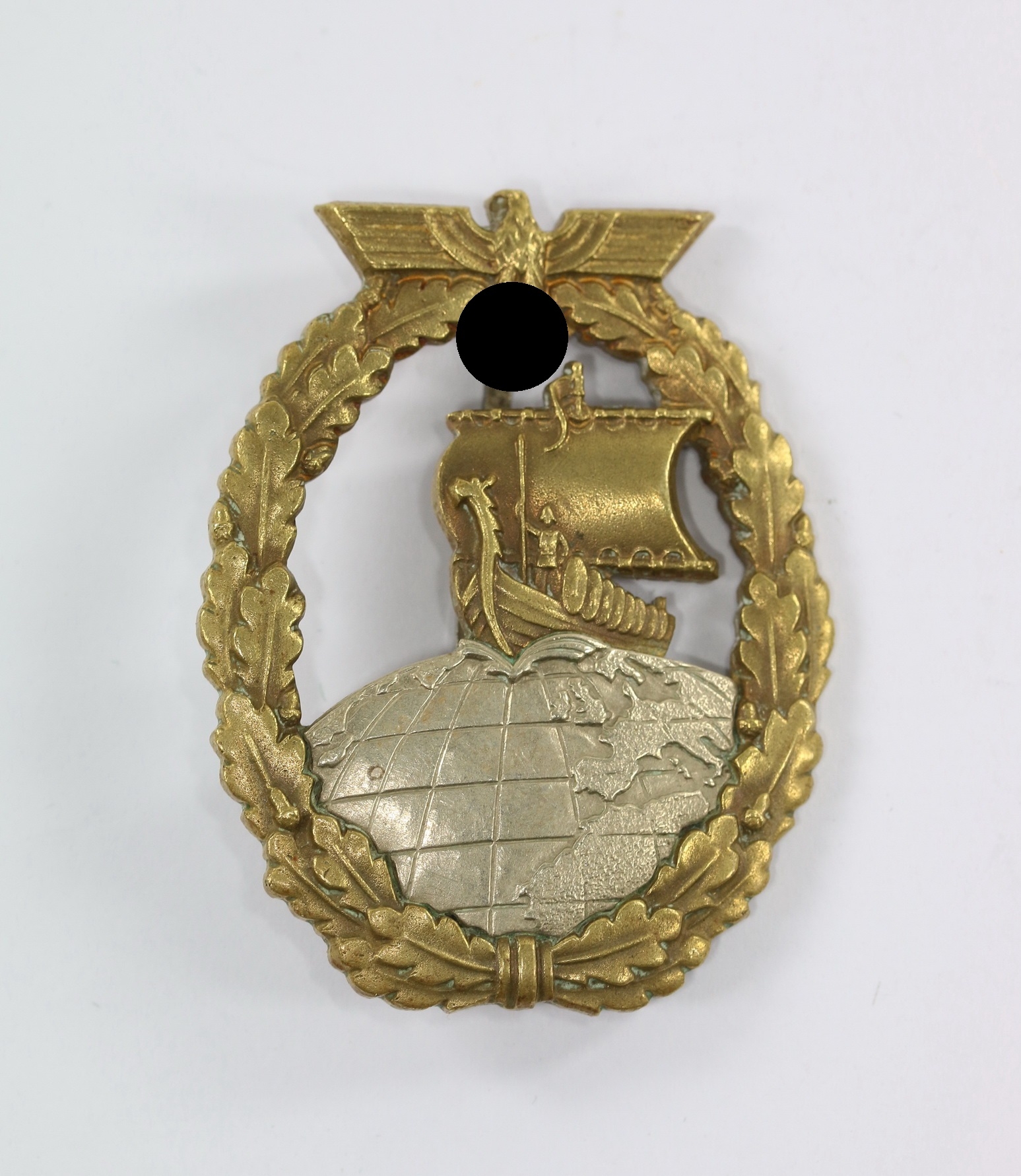 Buntmetall, sehr guter, leicht getragener Zustand. Mit sehr schöner Vergoldung. Die Weltkugel separat aufgesetzt. Ohne Hersteller, aber eine bekannte Variante der Firma C.E. Juncker, Berlin. Siehe GCA-Datenbank.