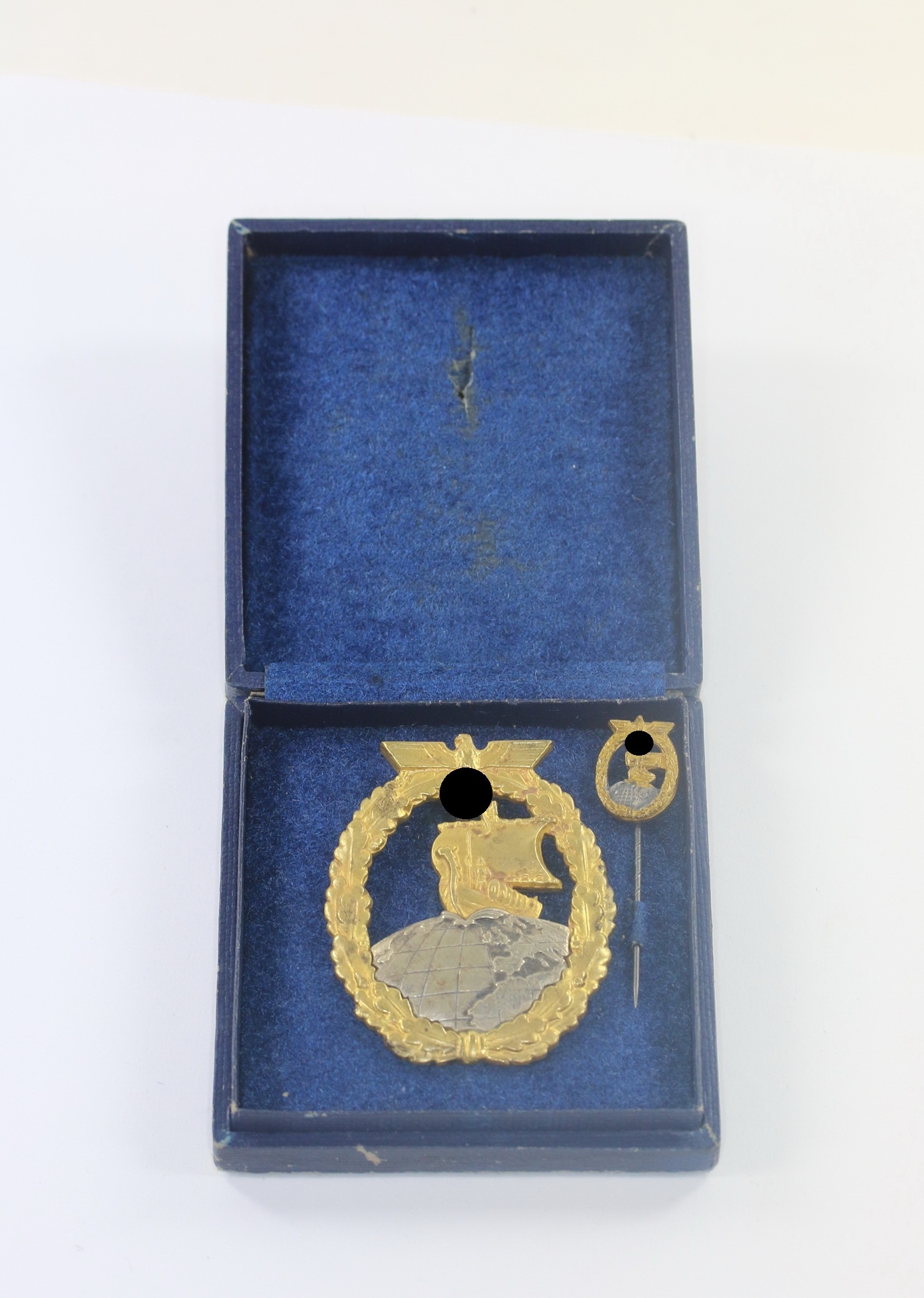Buntmetall, sehr guter, nur minimal getragener Zustand. Mit vollständiger Vergoldung. Die Weltkugel separat aufgesetzt. Ohne Hersteller, aber eine bekannte Variante der Firma C.E. Juncker, Berlin. Siehe GCA-Datenbank.