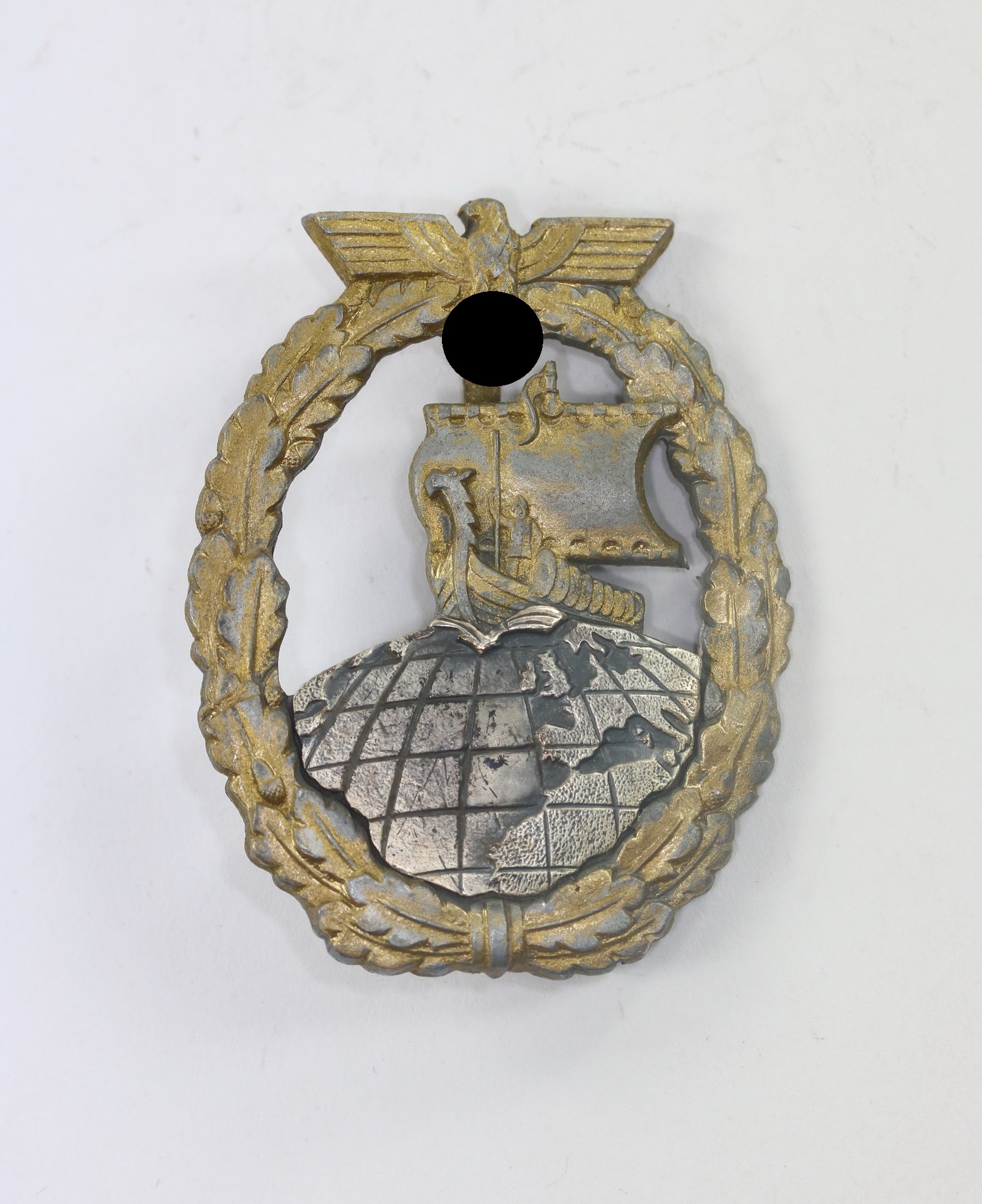 Zinkl, sehr guter, leicht getragener Zustand. Kranz und Schiff mit noch schöner Vergoldung, der aufgesetzte Globus mit noch sehr schöner Tönung. Ohne Hersteller, aber eine bekannte Variante der Firma Steinhauer & Lück, Lüdenscheid. Siehe GCA-Datenbank.