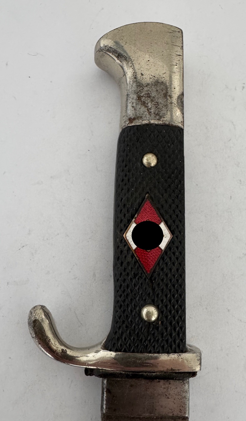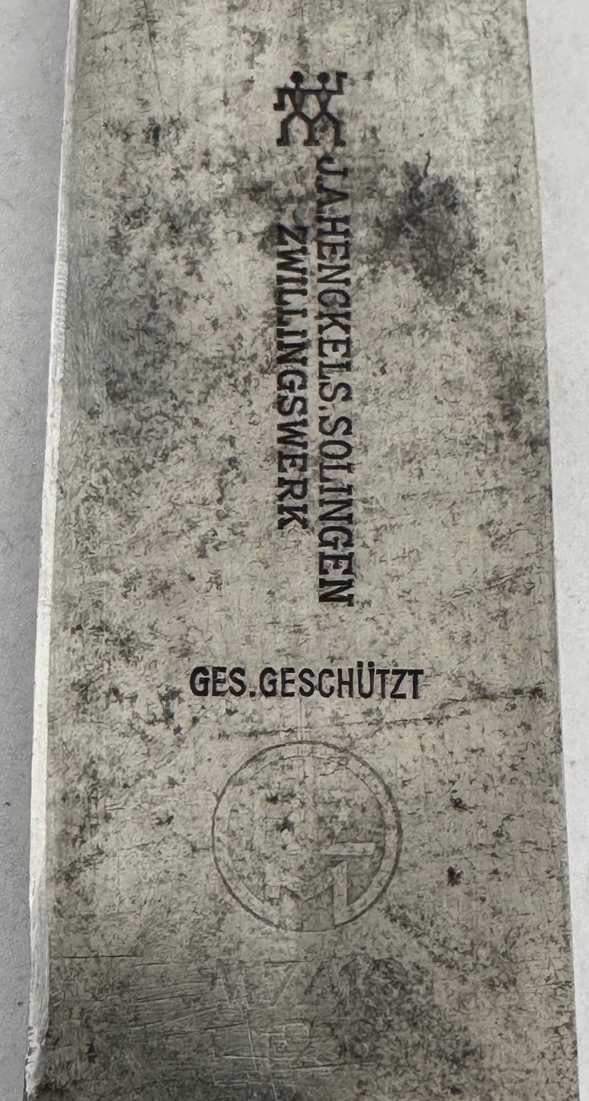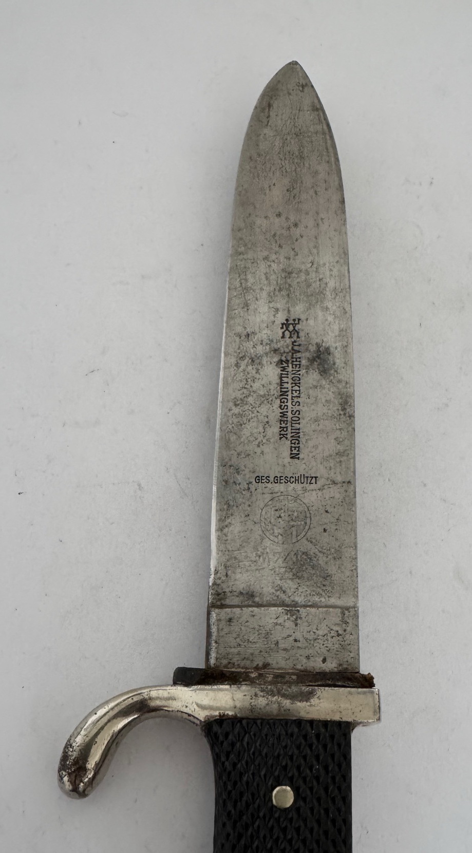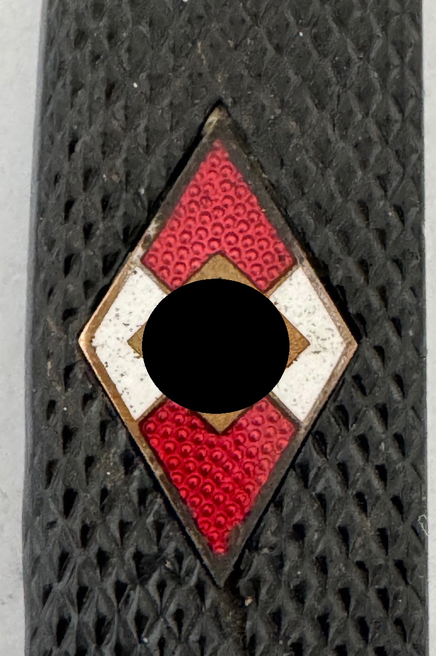 Das Fahrtenmesser in einen sehr guten, nur leicht geführten Zustand. Das Eisen Gefäß mit vollständiger Versilberung, die schwarzen Griffschalen ohne Fehler, die Nieten fest und unberührt. Die Raute unberührt und in einen einwandfreien Zustand, die Emaille ohne Fehler. Die HJ Raute, ganz typisch leicht beweglich. Die Klinge leicht fleckig, sonst einwandfrei. Auf der einen Seite die Devise der Hitlerjugend „Blut und Ehre“. Auf der anderen Seite die Hersteller Markierung „J.A. Henckels Solingen Zwillingswerke“ und der Hersteller Code „RZM M7/10“, ebenfalls für die Zwillingswerke (Doppelhersteller). Dazu die Jahreszahl „1936“ und „Ges. Geschützt“.
