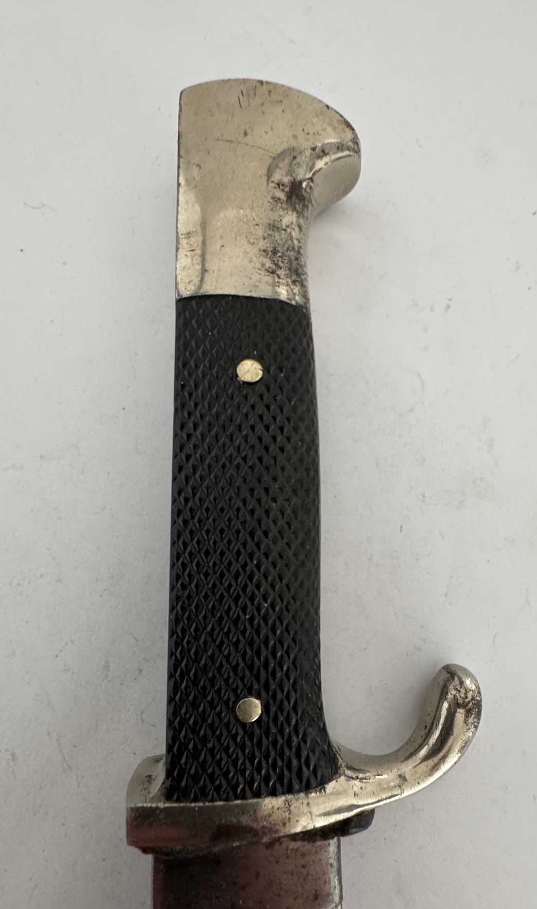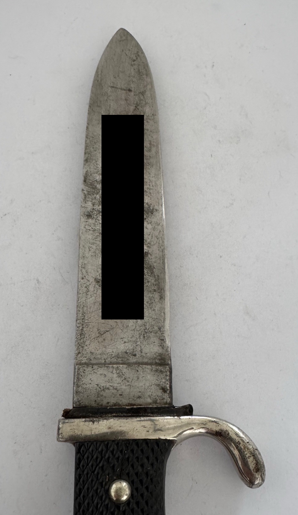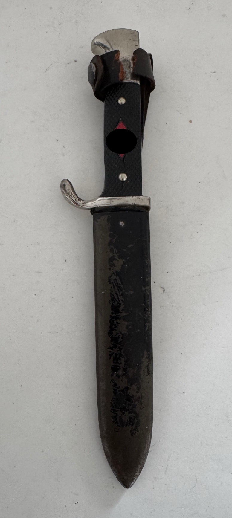 Das Fahrtenmesser in einen sehr guten, nur leicht geführten Zustand. Das Eisen Gefäß mit vollständiger Versilberung, die schwarzen Griffschalen ohne Fehler, die Nieten fest und unberührt. Die Raute unberührt und in einen einwandfreien Zustand, die Emaille ohne Fehler. Die HJ Raute, ganz typisch leicht beweglich. Die Klinge leicht fleckig, sonst einwandfrei. Auf der einen Seite die Devise der Hitlerjugend „Blut und Ehre“. Auf der anderen Seite die Hersteller Markierung „J.A. Henckels Solingen Zwillingswerke“ und der Hersteller Code „RZM M7/10“, ebenfalls für die Zwillingswerke (Doppelhersteller). Dazu die Jahreszahl „1936“ und „Ges. Geschützt“.