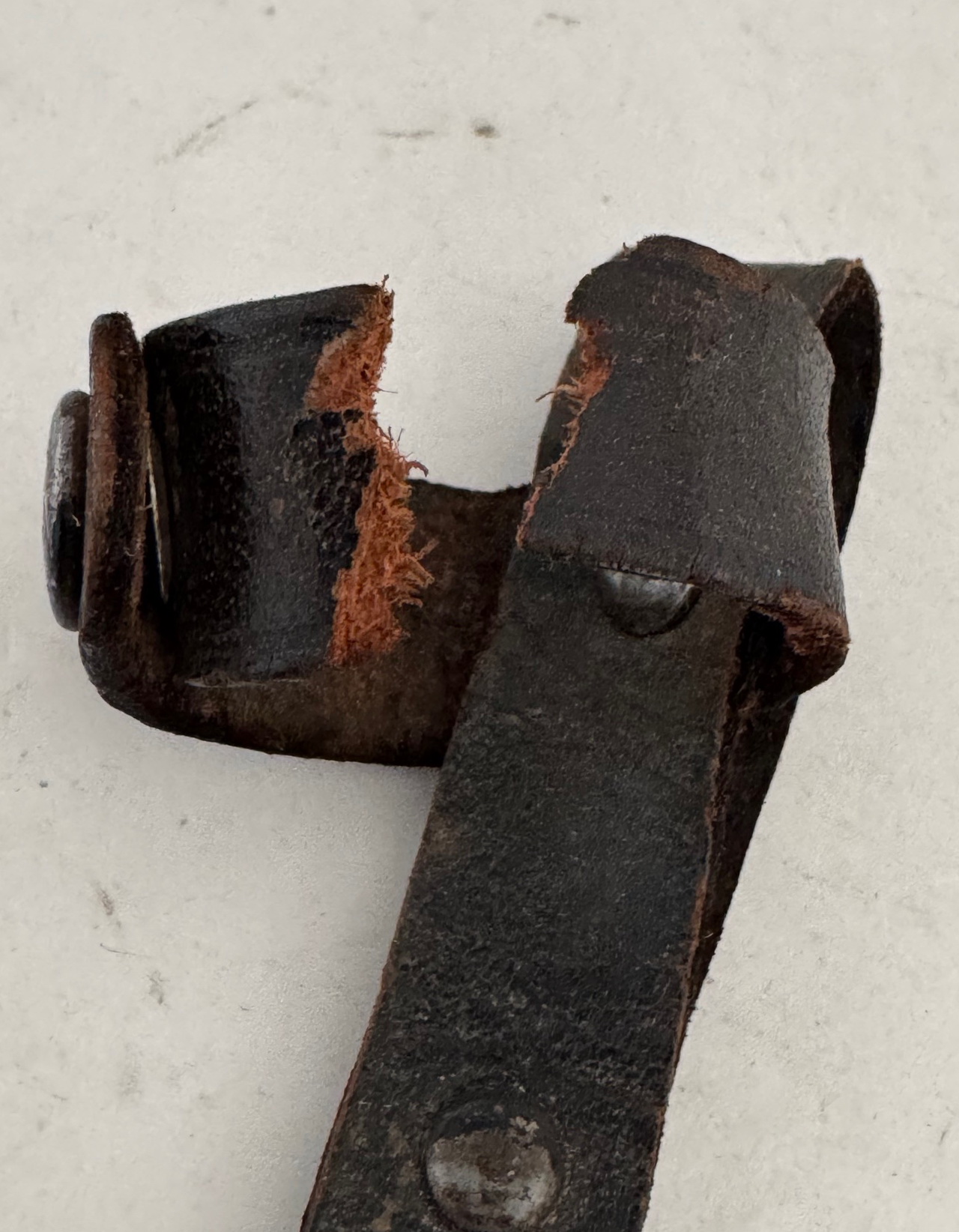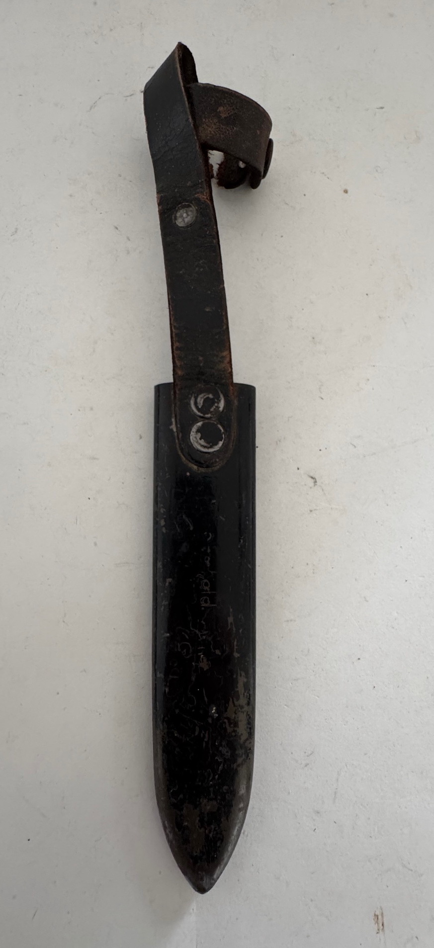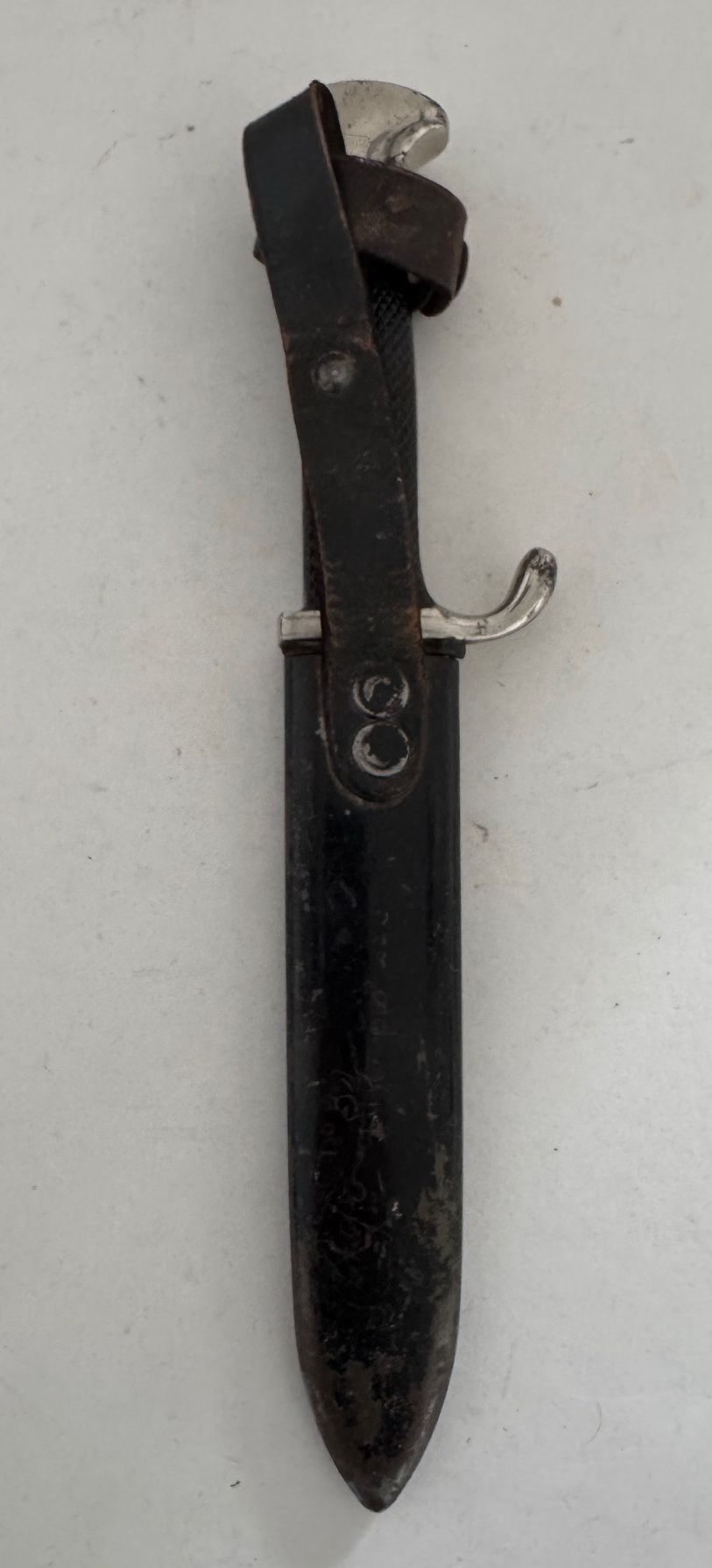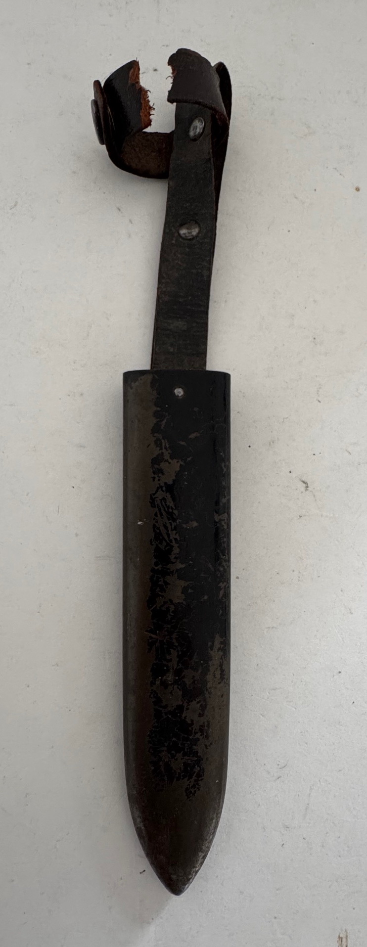 Die Scheide aus schwarz lackierten Eisenblech mit noch ca. 70% original Lackierung. Die Scheide ohne Beulen, etc.. Bei der Leder Beriemung, die Verschlusslasche kurz hinter den Druckknopf durchgerissen, aber alle teile vorhanden. Das Leder sonst in einen einwandfreien Zustand.