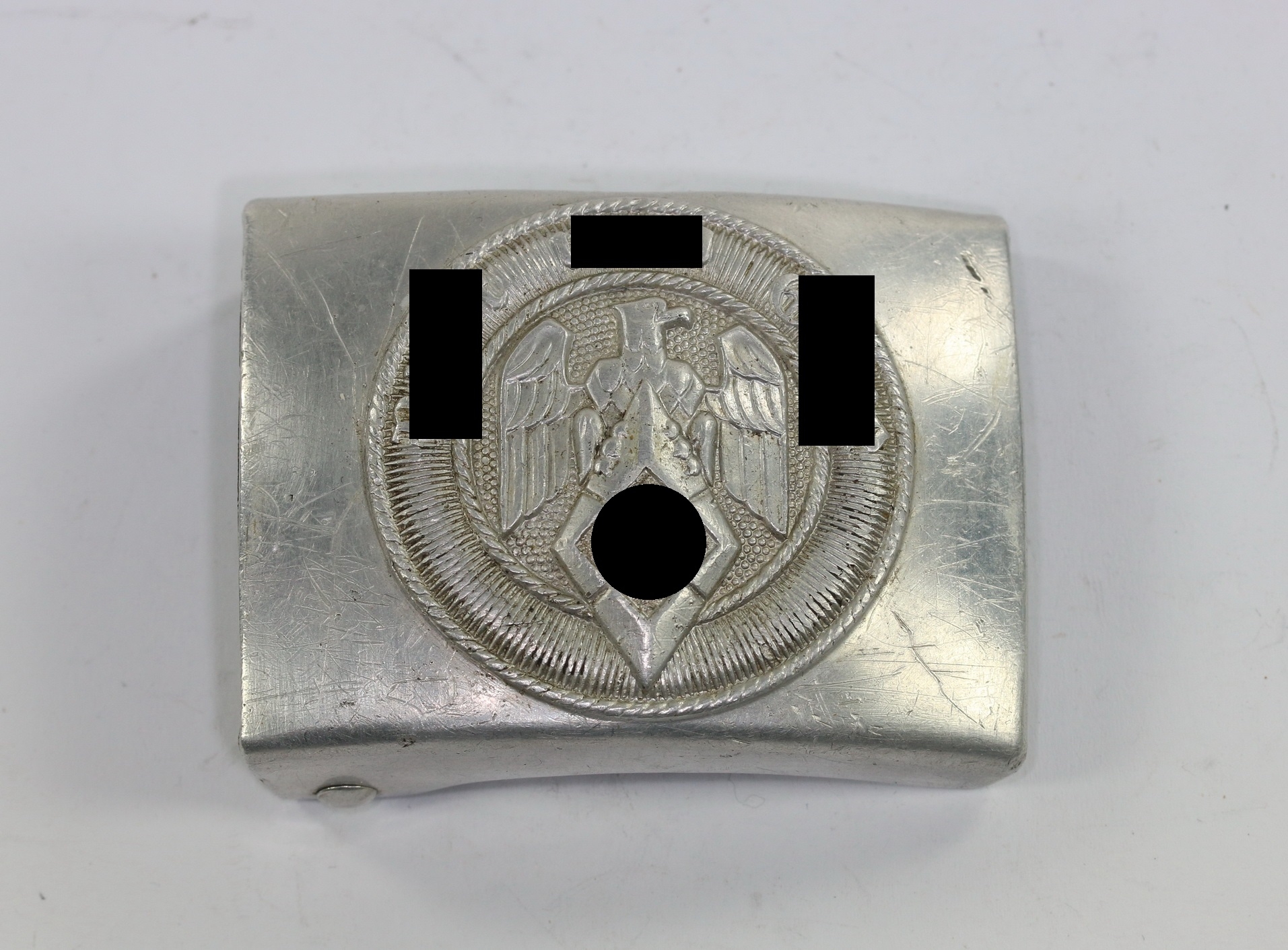 Aluminium durchgeprägt, sehr guter, ungetragener Zustand. Adler mit HJ Raute und Devise „Blut und Ehre“. Mit den Herstellern „RZM M4/110“ für die Firma Josef Feix & Söhne, Gablonz.