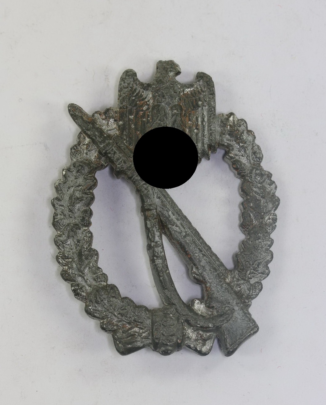 Zink, die Tragenadel fehlt(!), sonst guter, getragener Zustand. Mit Alters- und Lagerspuren. Rückseitig, unter dem Nadelbock die Hersteller Markierung AS im Dreieck. Welcher Hersteller sich hinter dieser Markierung verbirgt, ist heute unbekannt. Mit eingequetschten Nadelsystem.