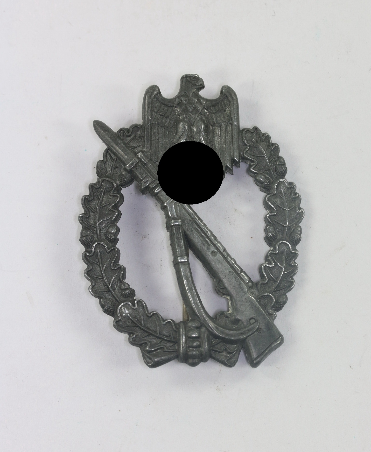 Zink, sehr guter, leicht getragener Zustand. Mit Hersteller Zeichen „AS“ im Dreieck, eines noch unbekannten Herstellers. Siehe GCA-Datenbank. Mit typischen, eingequetschten Nadelsystem.