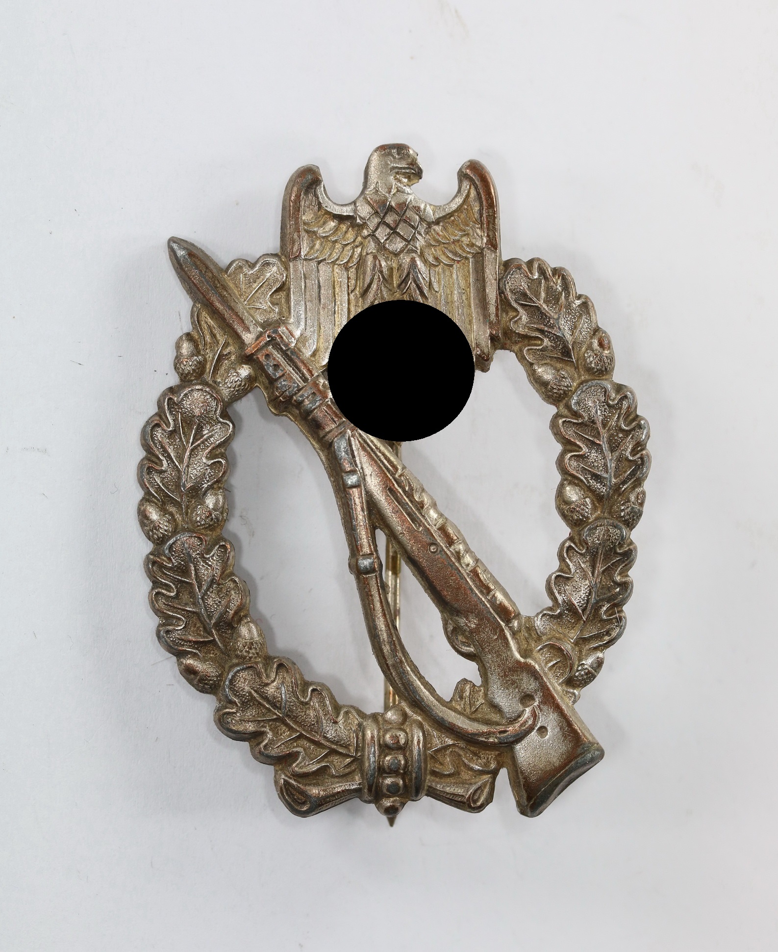 Zink, sehr guter, nahe zu ungetragener Zustand. Mit vollständiger, frostiger Versilberung, mit leichter Patina. Mit Hersteller „W.H.“ für die Firma Wilhelm Hobacher, Wien. Siehe GCA-Datenbank.