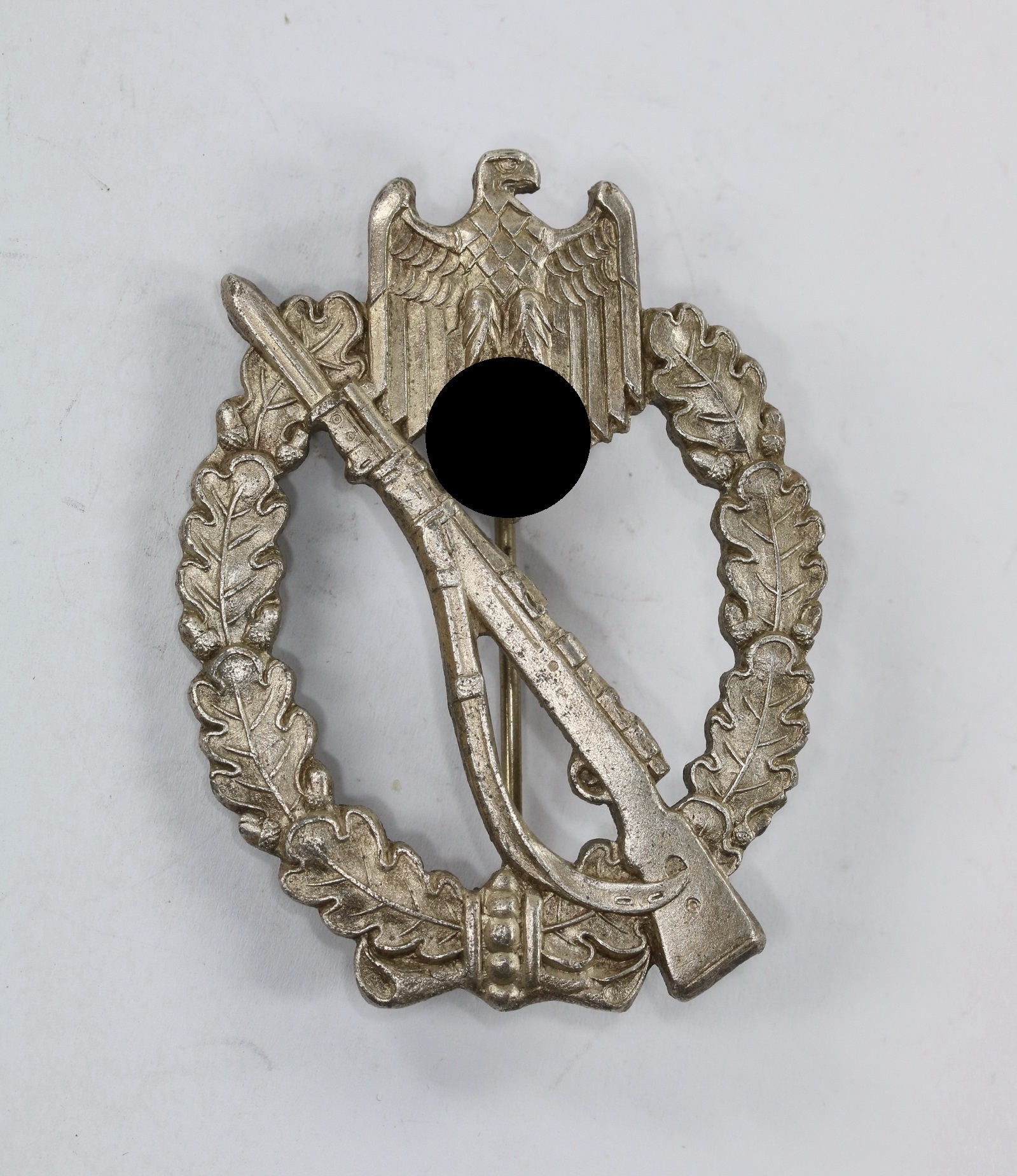 Zink, sehr guter, nahe zu ungetragener Zustand. Mit vollständiger Versilberung. Ohne Hersteller, aber eine bekannte Variante der Firma C.E. Juncker, Berlin. Der Nadelbock sehr sauber, neuzeitlich ersetzt(!).