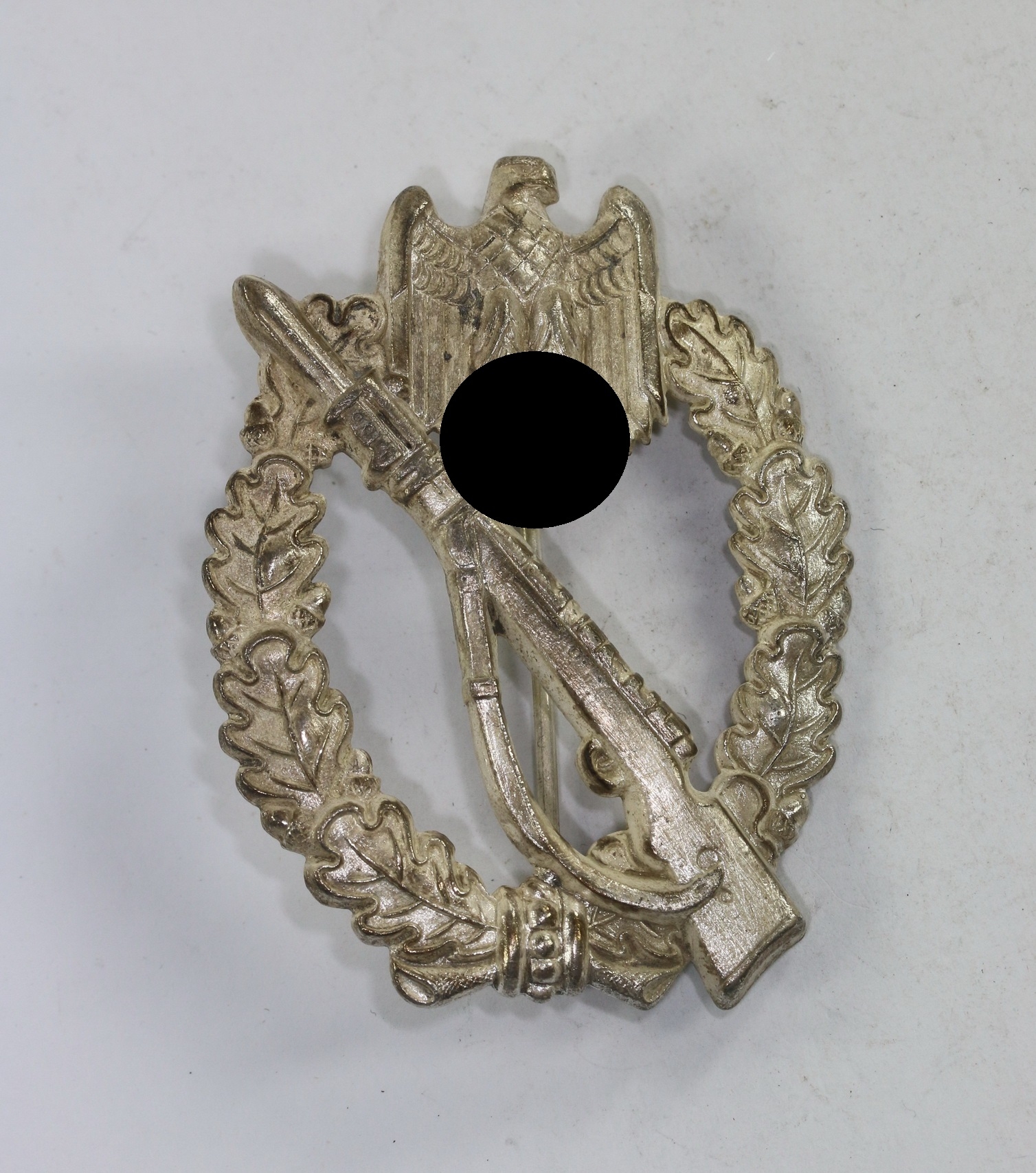 Zink, sehr guter, ungetragener Zustand. Mit vollständiger, frostiger Versilberung, Hakenkreuz und Kanten poliert, mit leichten Ansätzen von Patina. Ohne Hersteller, aber eine bekannte Variante der Firma Sohni, Heubach & Co., Oberstein (S.H.u.Co.) Siehe auch GCA-Datenbank.