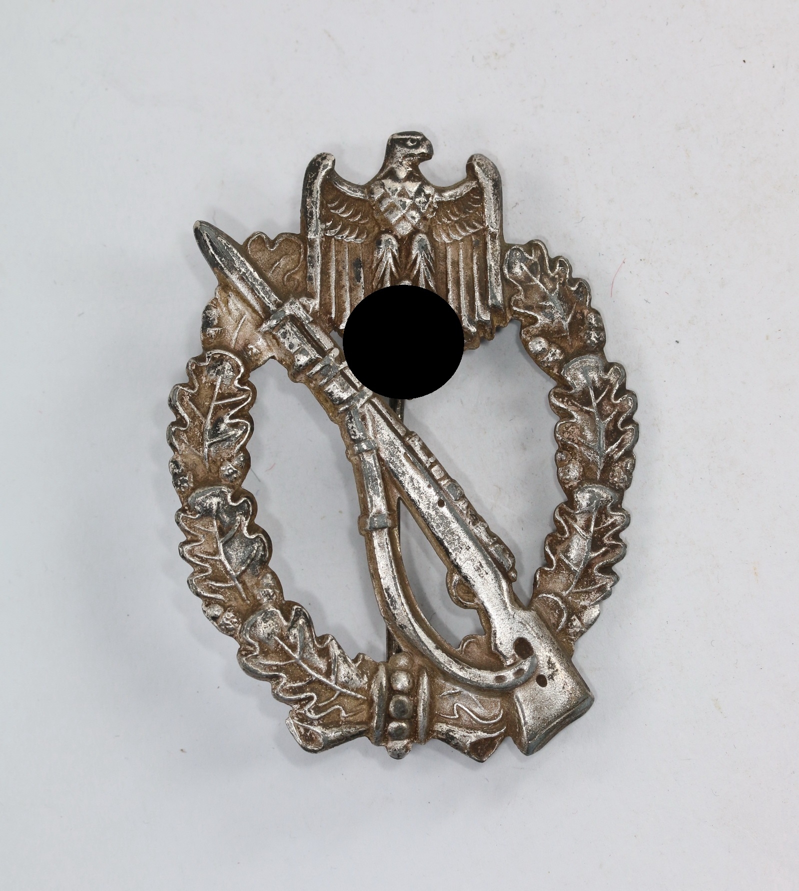 Zink, sehr guter, leicht getragener Zustand. Mit vollständiger Versilberung, mit Patina. Ohne Hersteller, aber eine bekannte Variante der Firma E.F. Wiedmann, Frankfurt a.M. (ÜÜ). Siehe GCA-Datenbank.