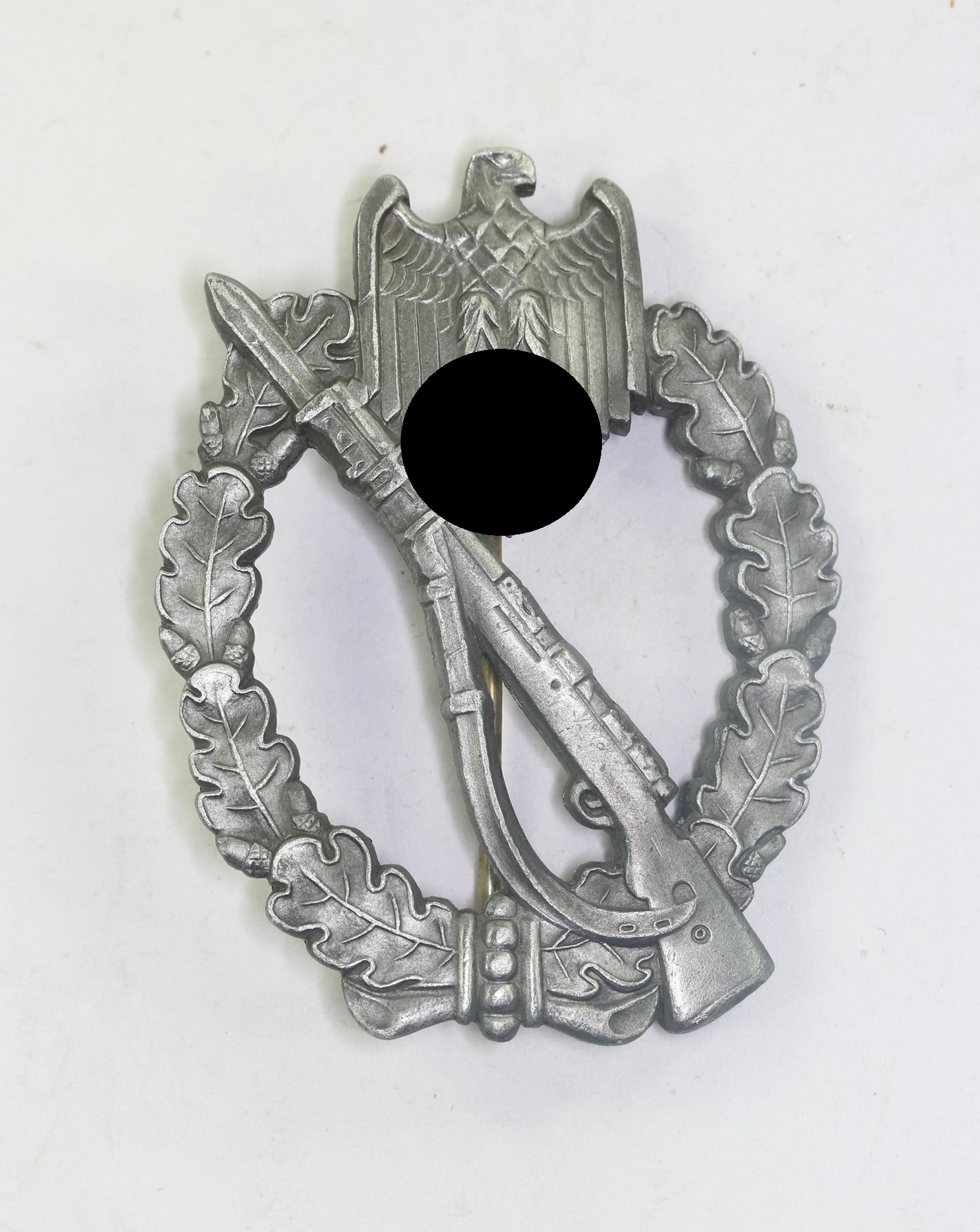 Zink, sehr guter, nahezu ungetragener Zustand. Mit vollständiger Versilberung. Ohne Hersteller, aber eine bekannte Variante der Firma Wilhelm Deumer, Lüdenscheid. Siehe GCA-Datenbank.