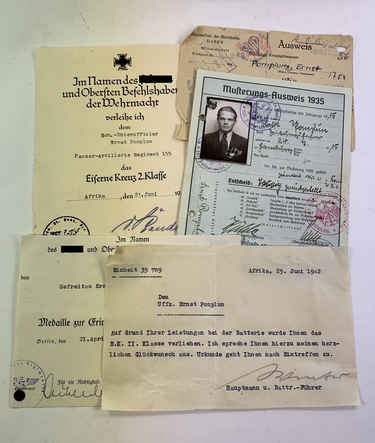 Urkunden und Papiere des Sanitätsunteroffiziers Ernst Pomlun. Er diente im Panzerartillerie Regiment 155.