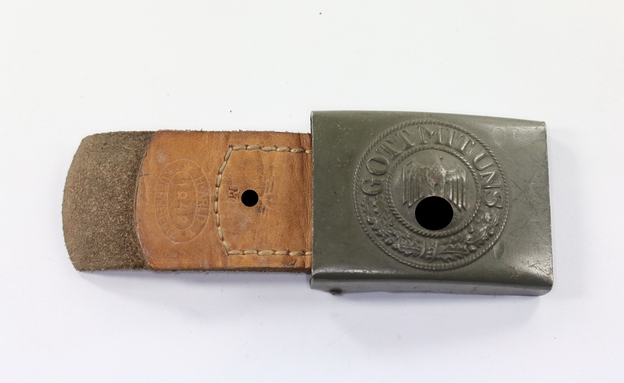 Eisen durchgeprägt, excellenter, absolut ungetragener Zustand. Mit vollständiger Feldgrauer Lackierung. Mit Hersteller „H.A.“ für die Firma H. Arld, Nürnberg und der Jahreszahl „42“. Mit original vernähter Lederzunge mit passenden Hersteller Stempel „H. Arld Nürnberg“ und der Jahreszahl „1942“. Darüber die Abnahme der Kriegsmarine Adler mit „M“.