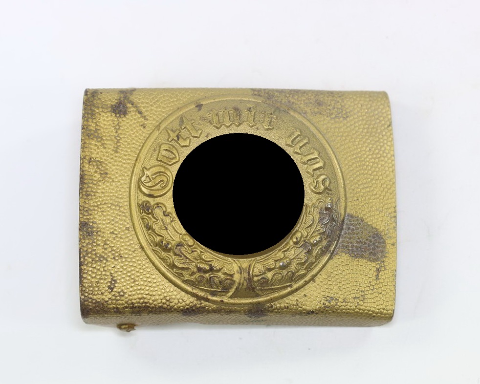 Eisen durchgeprägt und vergoldet. Sehr guter Zustand, mit fast vollständiger Vergoldung und leichten Alters- und Lagerspuren. Ohne Hersteller Markierung, aber eine bekannte Variante. Zentral ein auf der Spitze stehendes Hakenkreuz, darüber „Gott mit Uns“.