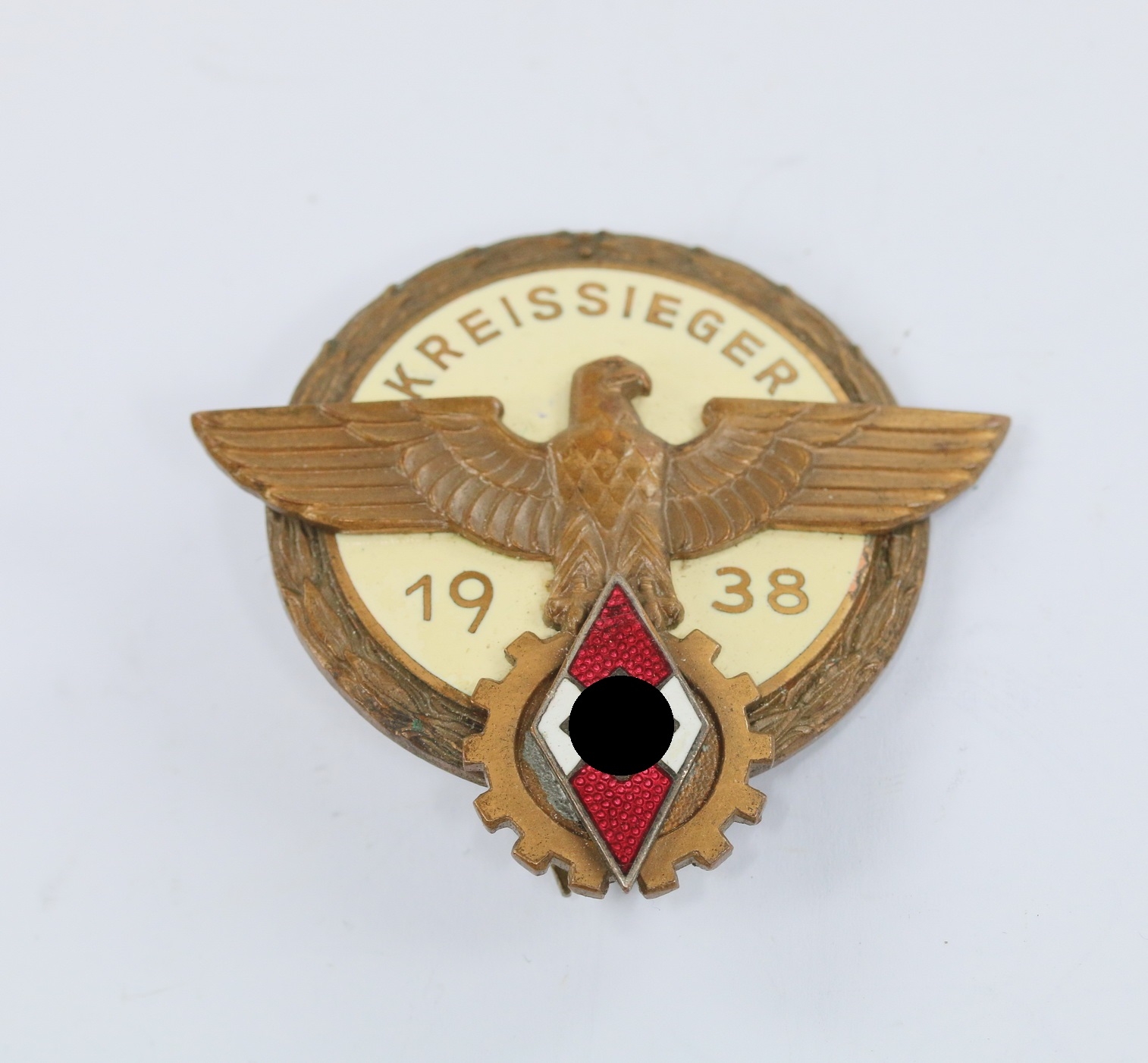 Buntmetall , sehr guter, nahe zu ungetragener Zustand. Mit vollständiger Bronzierung. Die Emaille ohne Fehler. Mit Hersteller „G. Brehmer Markneukirchen“.