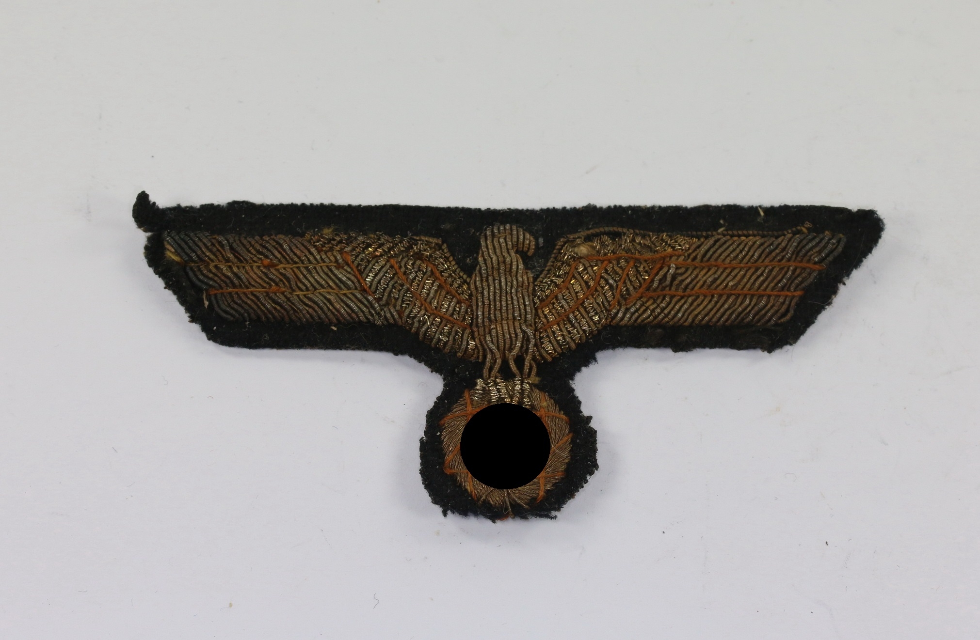 Goldener Metallfaden handgestickt auf dunkelblauen Tuch. Sehr guter, leicht getragener Zustand.