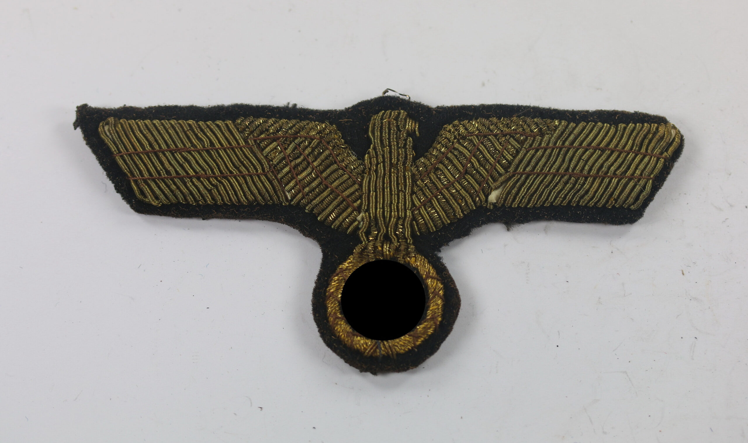 Goldener Metallfaden handgestickt auf dunkelblauen Tuch. Sehr guter, nahe zu ungetragener Zustand.