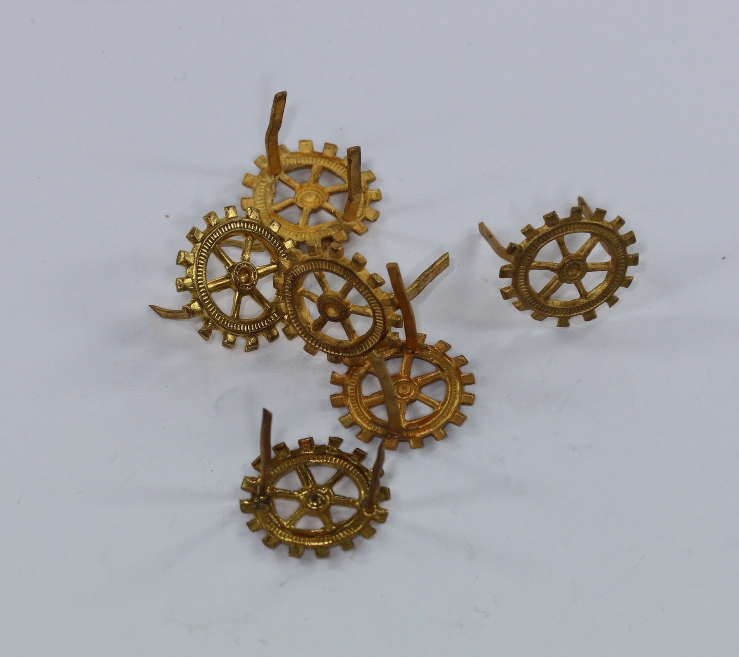 Buntmetall vergoldet, sehr guter, ungetragener Zustand. Die Splinte vollständig und einwandfrei. Sechs Stück vorhanden, Preis gilt pro Stück.