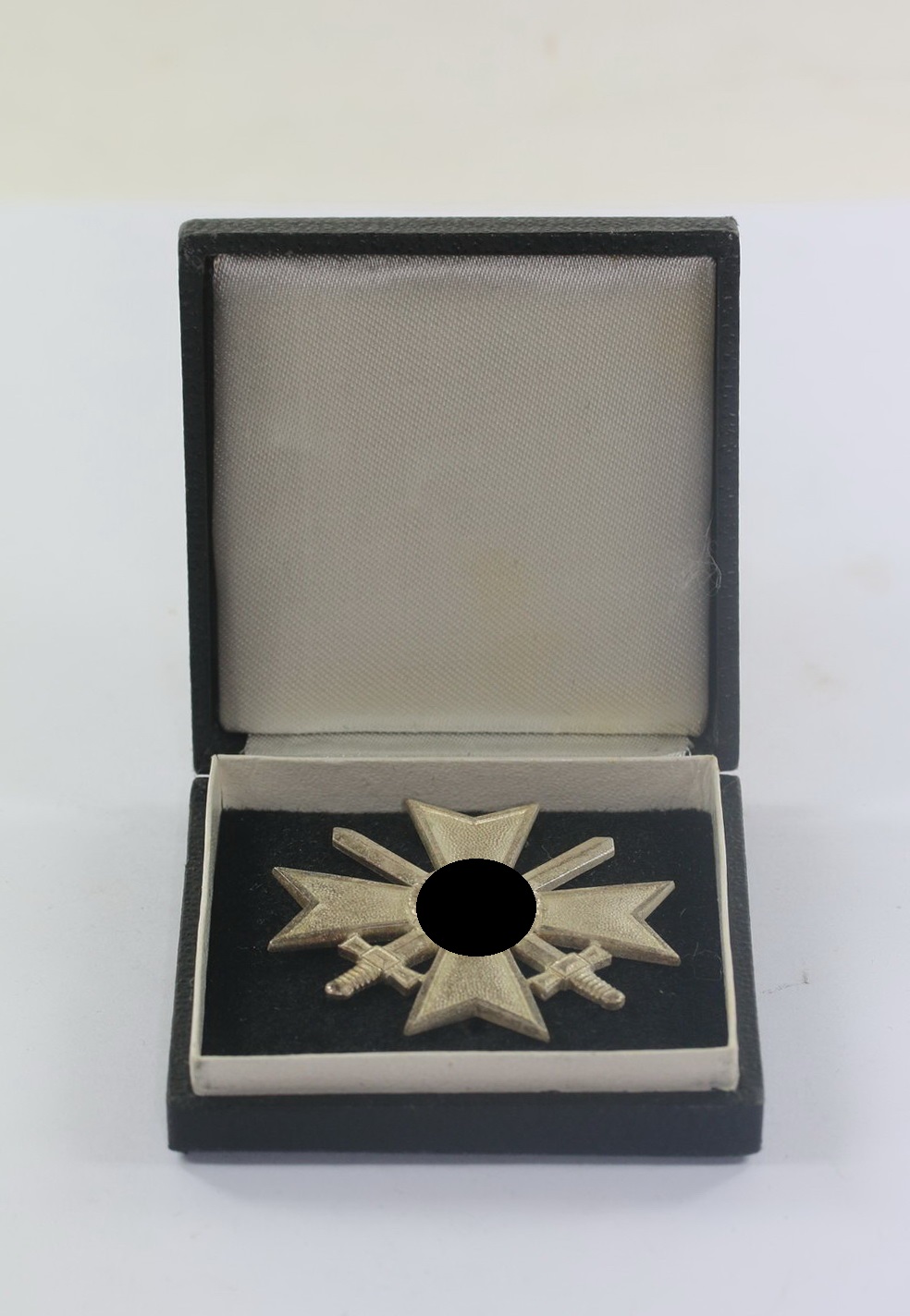 Das Kriegsverdienstkreuz aus versilberten Buntmetall, excellenter, ungetragener Zustand. Mit vollständiger Versilberung und toller, unberührter Patina. Auf der Nadel die codierte Hersteller Markierung „1“ für die Firma Deschler & Sohn aus München.