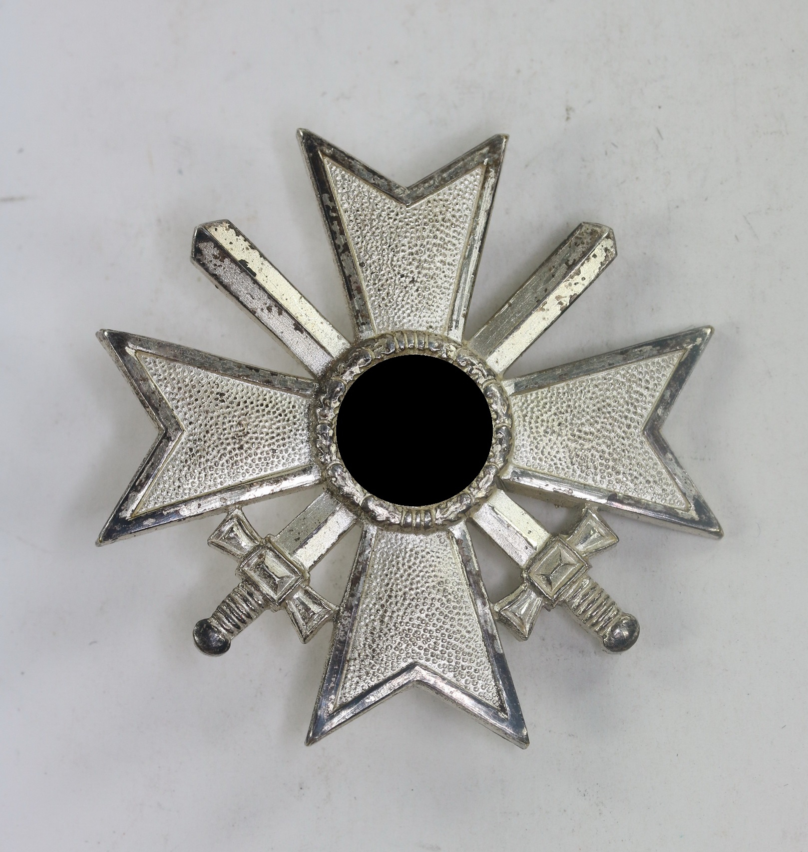Buntmetall, sehr guter, nahe zu ungetragener Zustand. Mit vollständiger Versilberung. Hakenkreuz und kanten poliert. Mit leichten Ansätzen von Patina. Ohne Hersteller, aber eine bekannte Variante der Firma Petz & Lorenz, Unterreichenbach. Mit den für Petz & Lorenz typischen, markanten Nadelsystem.