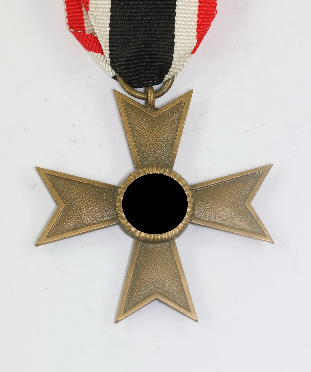 Das Kriegsverdienstkreuz gefertigt aus Buntmetall. Sehr guter, nahezu getragener Zustand. Mit vollständiger Bronzierung. Im Bandring die Hersteller Markierung „52“ für die Firma Gottlieb & Wagner aus Idar Oberstein. Mit originalem Trageband.