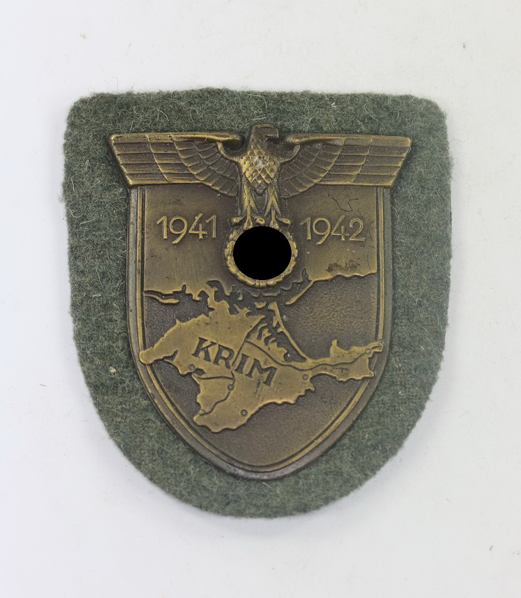 Auf der Vorderseite des Ärmelschildes, der nach links blickende Hoheitsadler, die Flügel weit gespannt, in den Klauen ein auf der Spitze stehendes Hakenkreuz in Eichenlaubkranz. Darunter die Jahreszahl „1942“ (das Jahr der Schlacht um die Halbinsel Krim, in Russland). Darunter die detaillierten Umrisse der Krim, darauf der Schriftzug „Krim“.