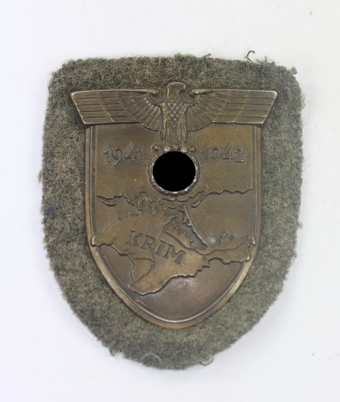 Eisenblech bronziert, sehr guter, nur leicht getragener Zustand. Mit vollständiger Bronzierung. Ohne Hersteller Markierung, aber eine bekannte Variante, siehe GCA-Datenbank Typ 3.5A. Vollständig mit allen Splinten, der Gegenplatte und ca. 90% der hellen Papierabdeckung.