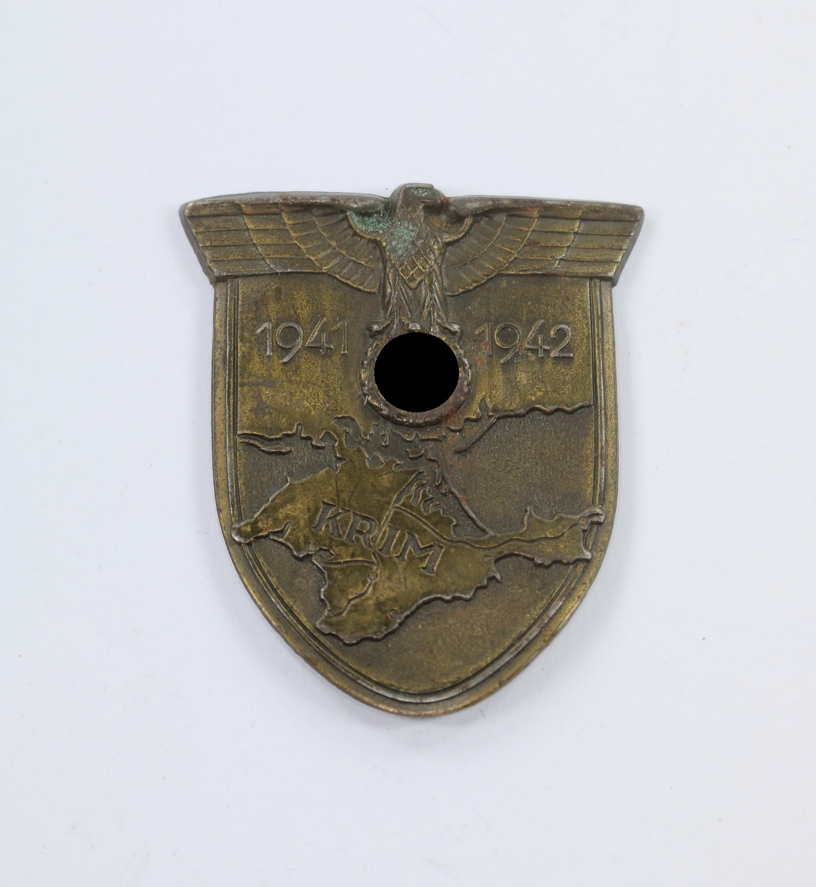 Eisenblech, sehr guter, leicht getragener Zustand. Mit vollständiger Bronzierung. Alle Splinte vorhanden, ohne Gegenplatte und Stoff.
