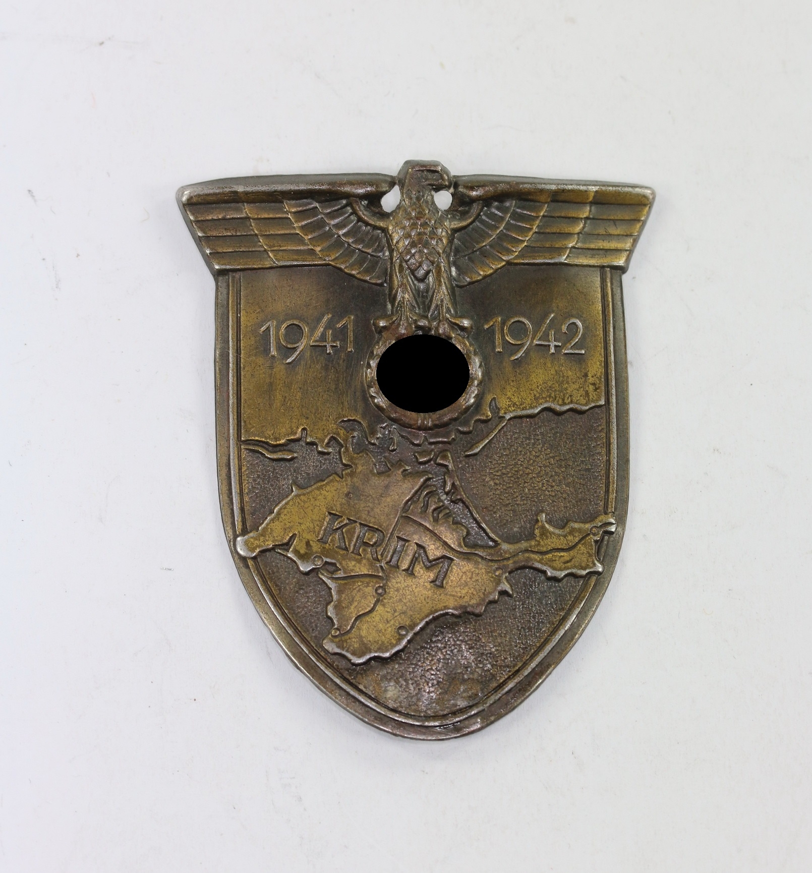 Eisenblech, sehr guter, leicht getragener Zustand. Mit vollständiger Bronzierung. Alle Splinte abgebrochen, ohne Gegenplatte und Stoff.