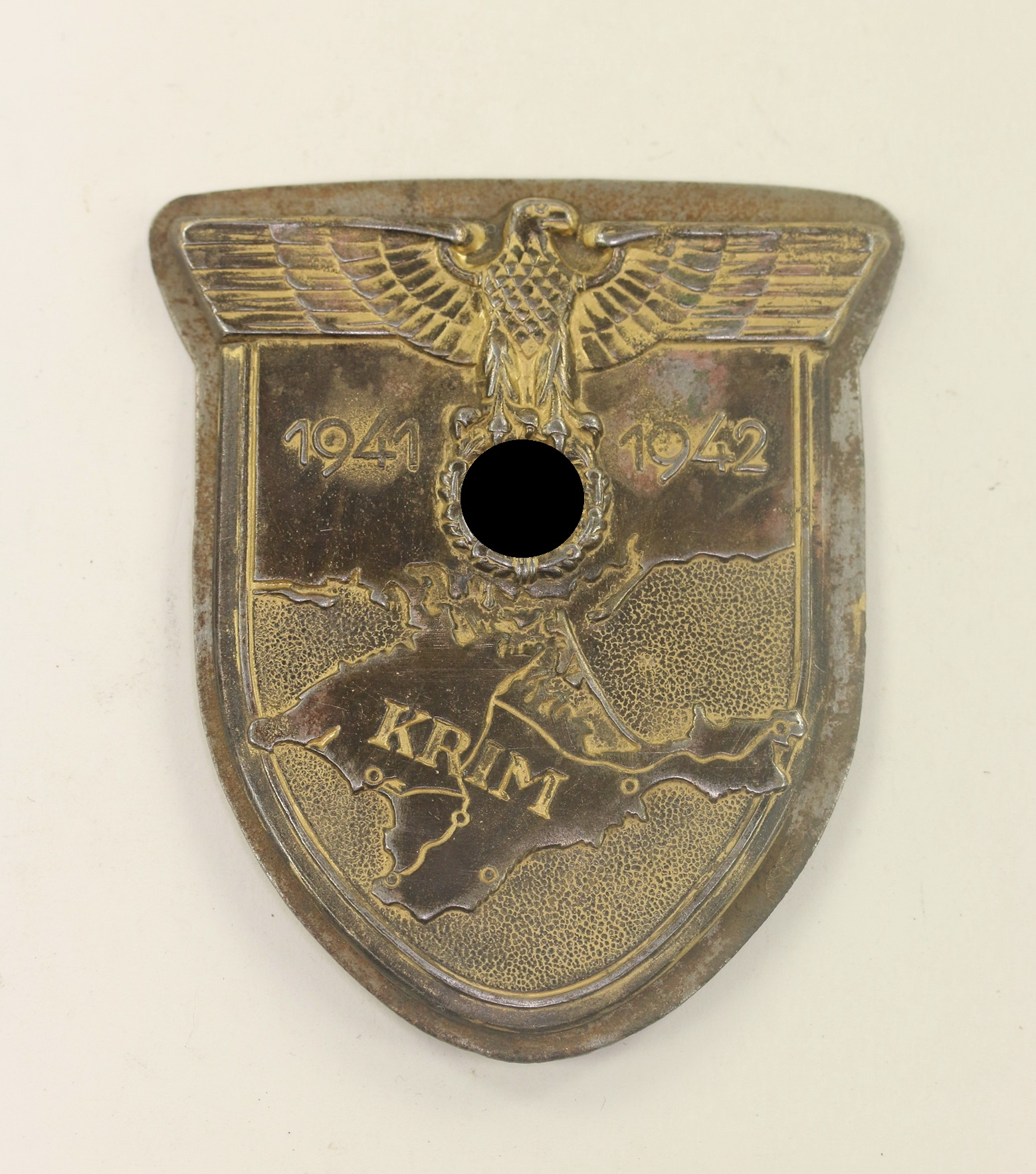 Eisen, sehr guter, getragener Zustand. Alle vier Splinte udn die gegenplatte vollständig vorhanden. Ohne Hersteller, aber eine bekannte Variante. Siehe GCA-Datenbank, Typ 3.7.