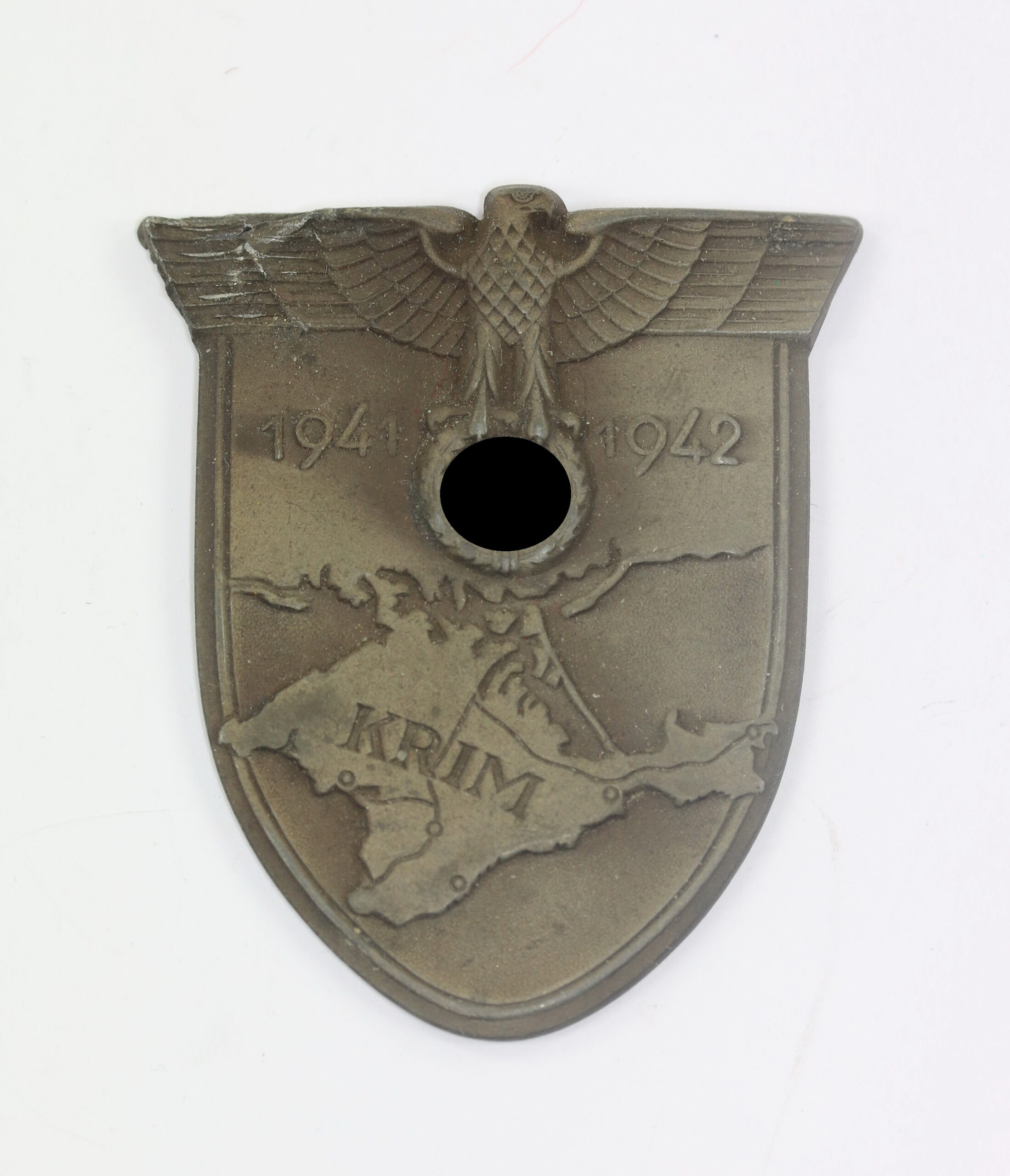 Zink, sehr guter, getragener Zustand. Ohne Hersteller, aber eine bekannte Variante der Firma Wilhelm Deumer, Lüdenscheid. Siehe GCA-Datenbank, Typ 3.1 Wilhelm Deumer. Ohne Splinte, gegenplatte, etc..