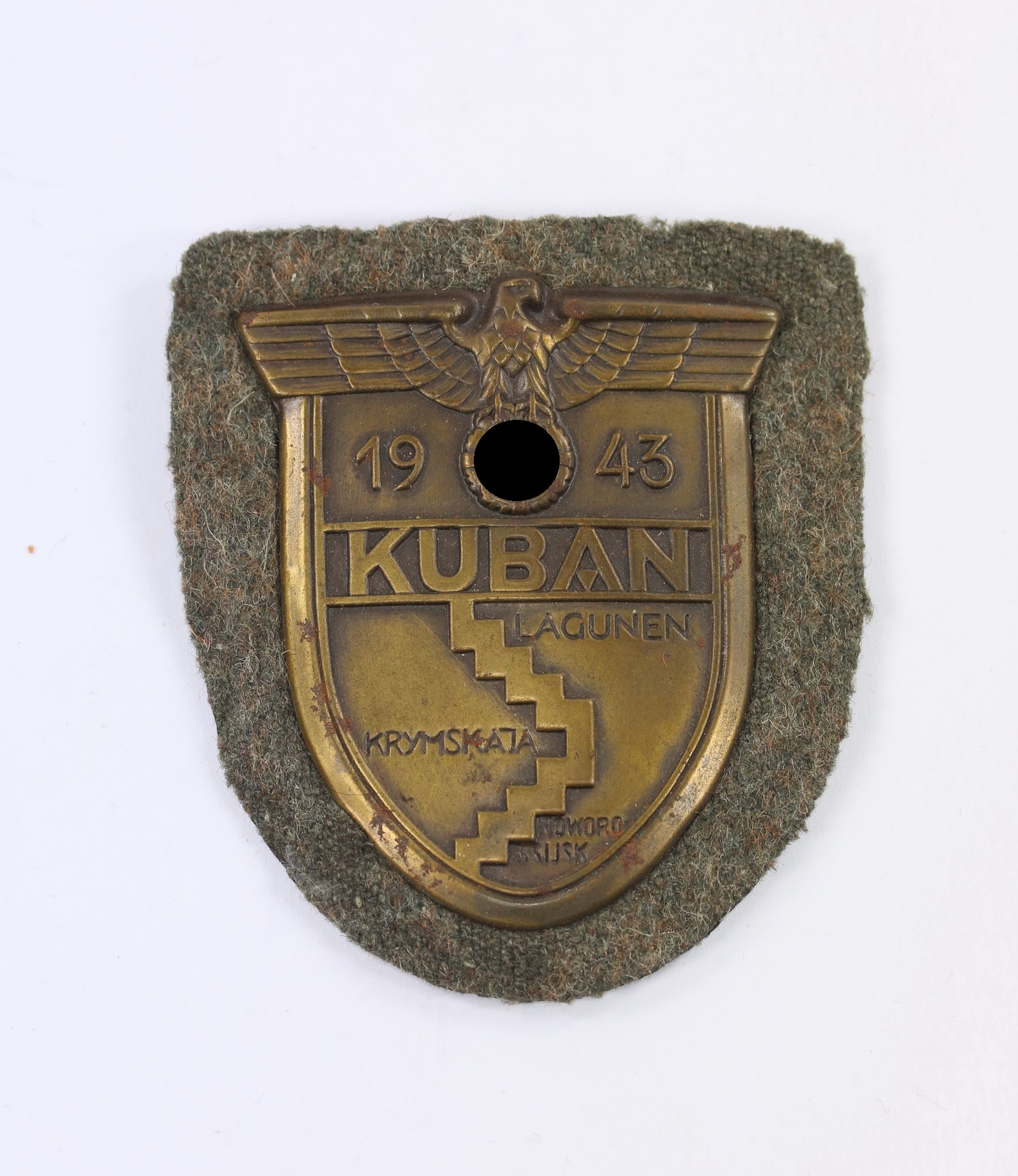 Eisen bronziert, sehr guter, nahe zu ungetragener Zustand. Mit vollständiger Bronzierung. Ohne Hersteller, aber eine bekannte Variante Typ 5.3, siehe GCA-Datenbank. Vollständig mit allen vier Splinten (Seitenlaschen), der Gegenplatte und der typischen schwarzen Papierabdeckung.
