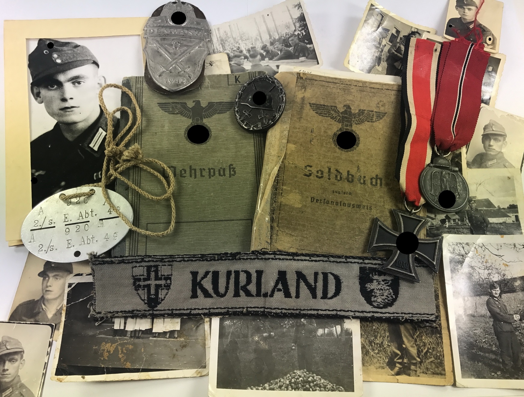 – Seinen Wehrpass, ebenfalls vollständig mit Foto und allen Eintragungen, inklusive Ärmelband Kurland