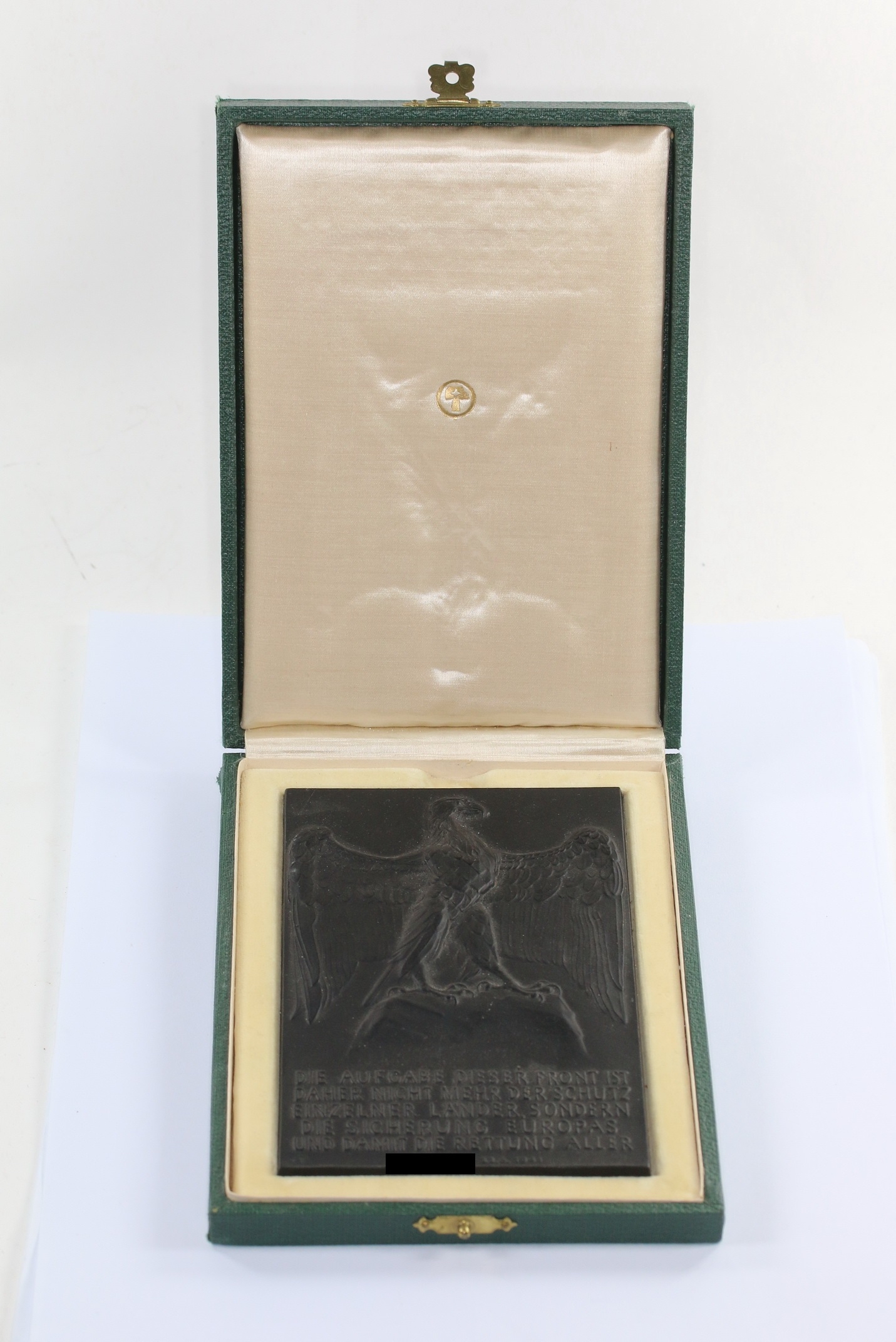Eisen Guss, excellenter Zustand. Adler auf Fels, darunter „Die Aufgabe dieser Front ist daher nicht mehr der Schutz Einzelner Länder, sondern die Sicherung Europas und damit Rettung Aller Adolf Hitler 22.6.1941“. Rückseitig mit Aufhänger. Vorderseitig unten links die Gussmarke der bekannten Lauchhammer Eisengießerei . Maße ca. 15,5 X 9 cm.