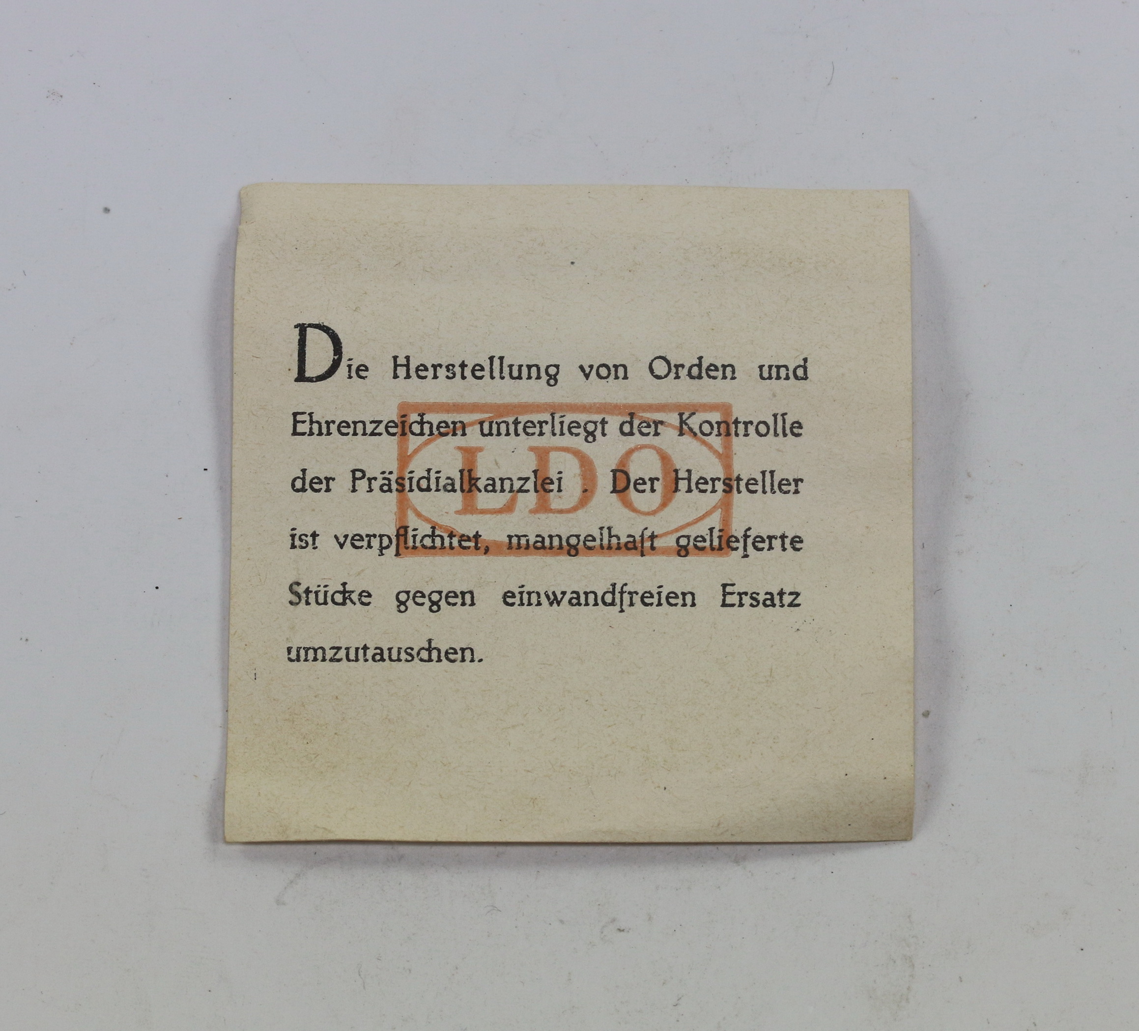 Sehr guter, nur minimal gebrauchter Zustand. Maße ca. 50 x 50 mm. „Die Hersteller von Orden und Ehrenzeichen unterliegen der Kontrolle der Präsidialkanzlei. Der Hersteller ist verpflichtet, mangelhaft gelieferte Stücke gegen einwandfreien Ersatz umzutauschen“. Im Hintergrund in rot das LDO (Leistungsgemeinschaft Deutscher Ordenhersteller) Logo in der 2, Form. Rückseitig gestempelt 12/42. Passent für z.B. EK-1, KVK 1. Kl., etc..