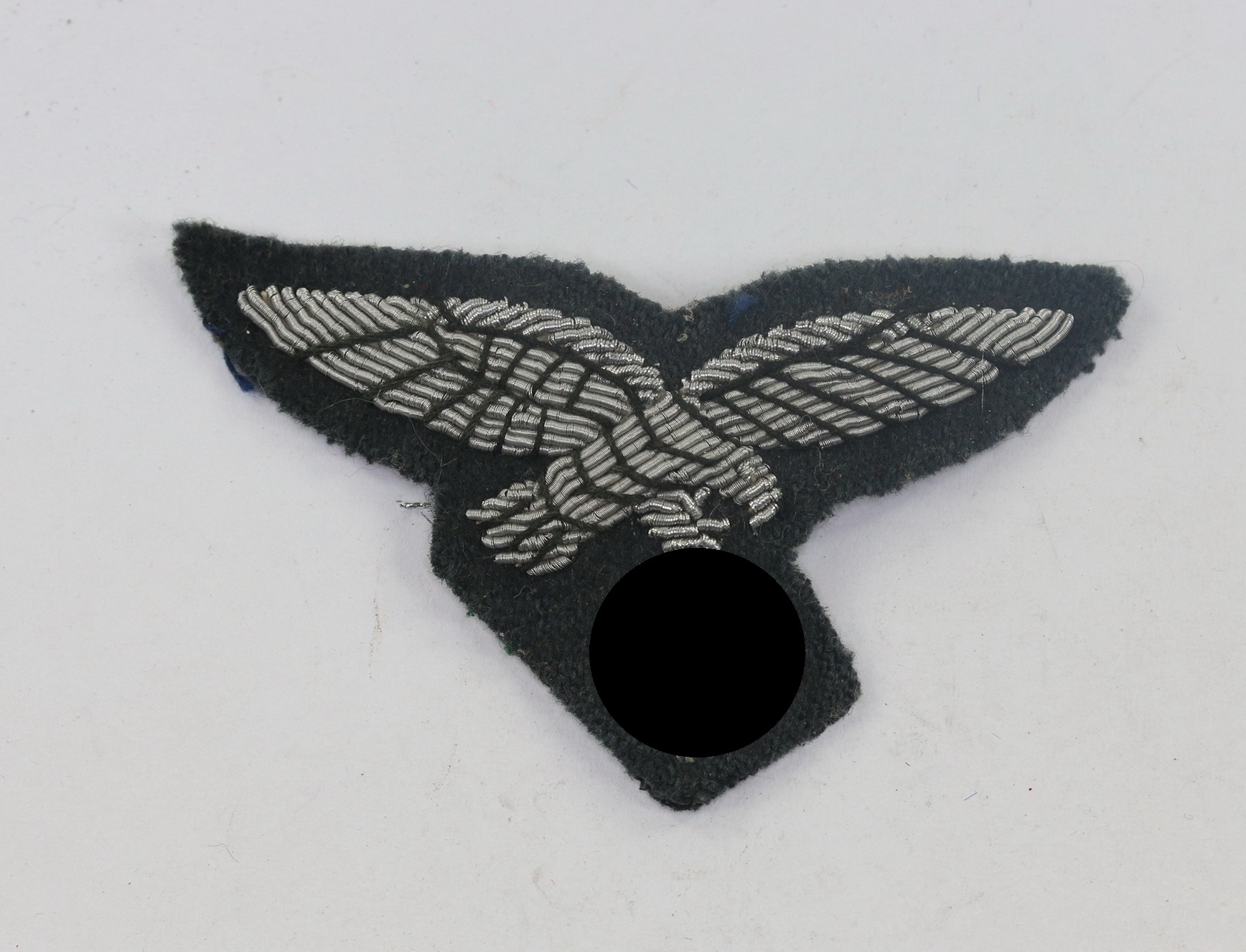 Metallfaden, handgestickte Ausführung. Der Adler das 1. Modell der Luftwaffe. Guter, getragener Zustand. Selten!