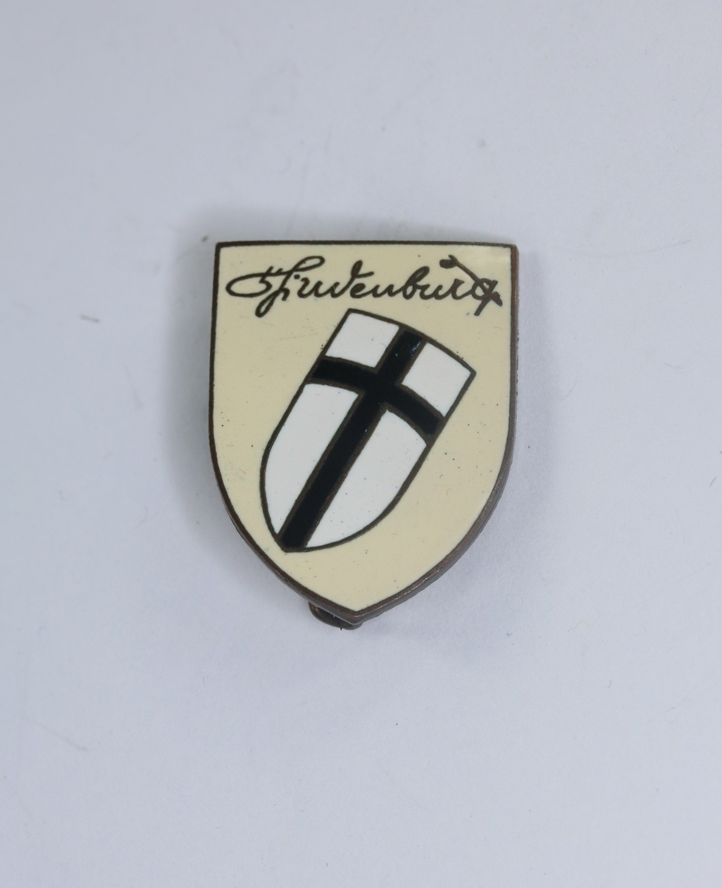Buntmetall emailliert, sehr guter, nur minimal getragener Zustand. Die Emaille ohne Fehler.