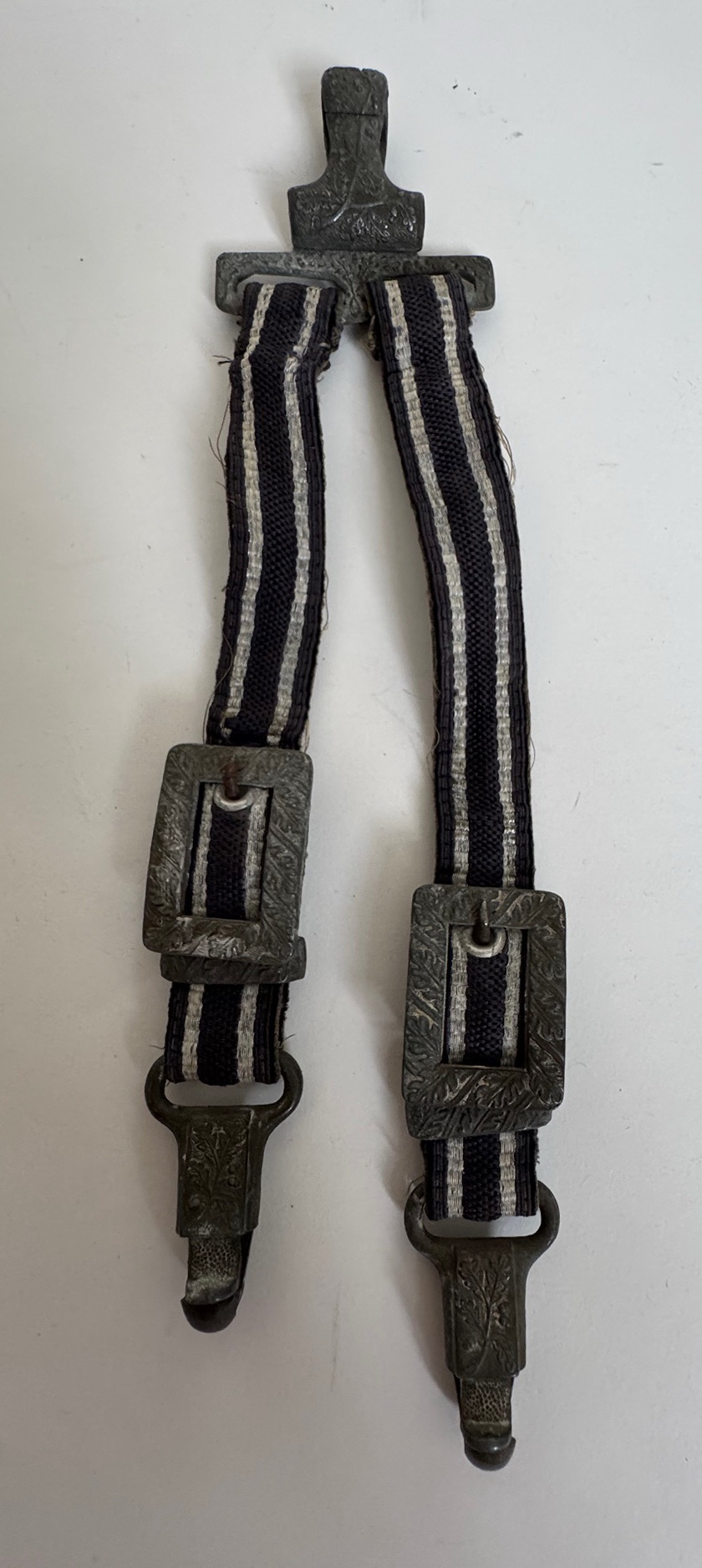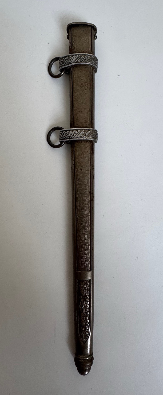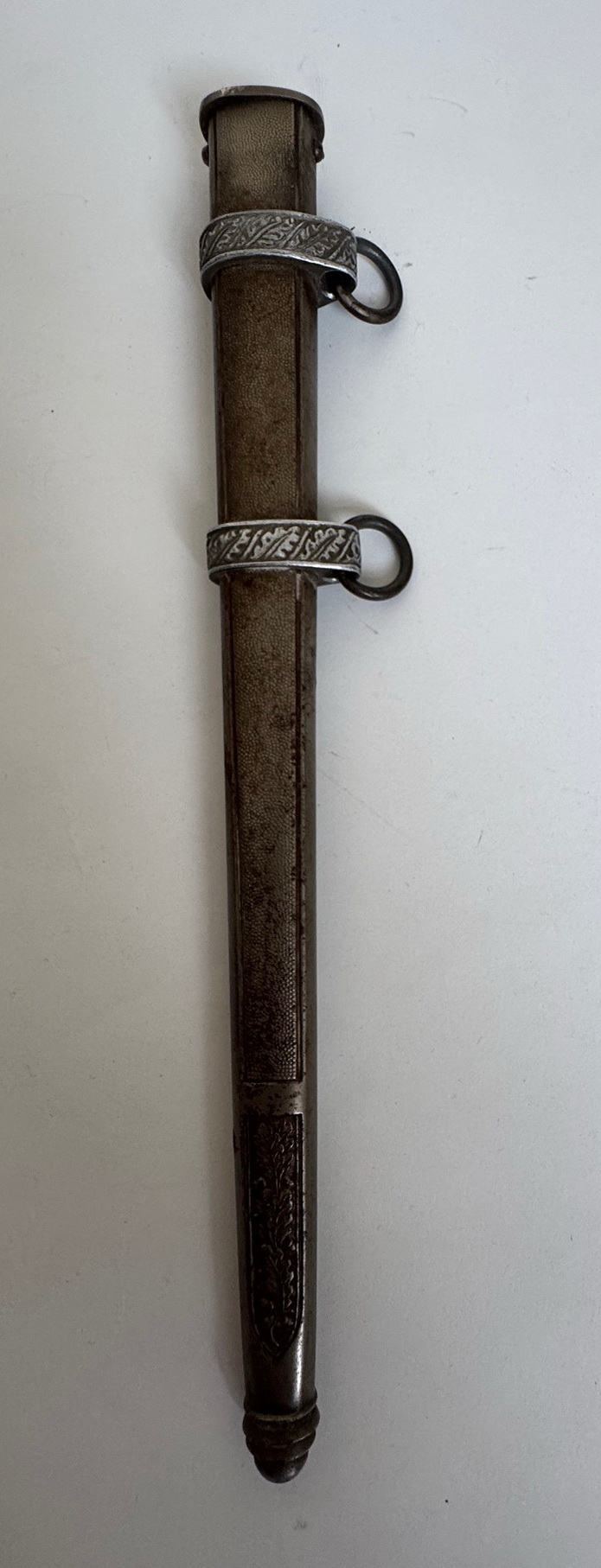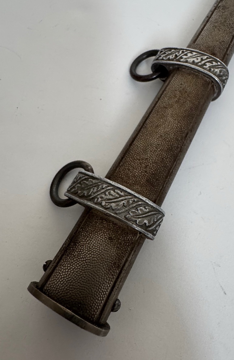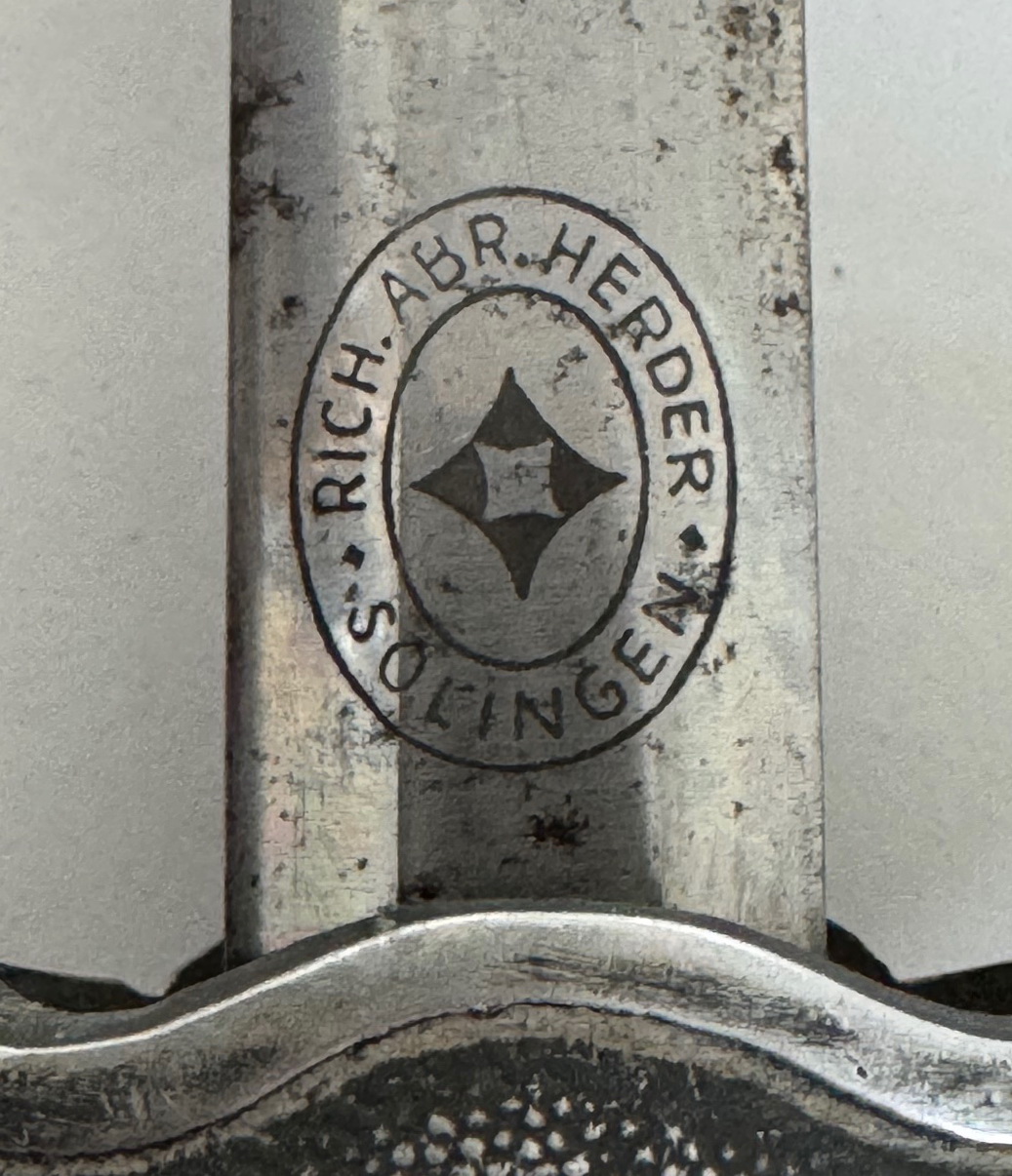 Sehr guter, leicht getragener Zustand. Der orange Griff ohne Fehler, die Wicklung vollständig und fest. Knauf und Parierstange in einen sehr guten Zustand, mit vollständiger Versilberung. Die Scheide aus versilberten Eisen, ohne Fehler. Die Klinge etwas leicht fleckig, sonst einwandfrei. Darauf der Hersteller Markierung „Rich. Abr. Herder Solingen“. Mit original gebundenen Portepee und Gehänge. Das Gehänge in einen sehr guten, leicht getragenen Zustand. Vollständig und funktionsfähig.