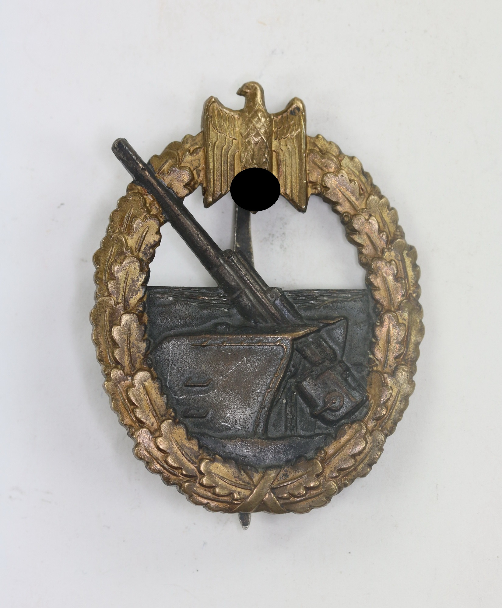 Buntmetall, sehr guter, nahezu ungetragener Zustand. Der Kranz mit vollständiger Vergoldung. Das Geschütz mit vollständiger, dunkler Tönung. Rückseitig „FEC Otto Placzek Berlin“. Mit Hersteller „C.E. Juncker Berlin“, siehe GCA-Datenbank.