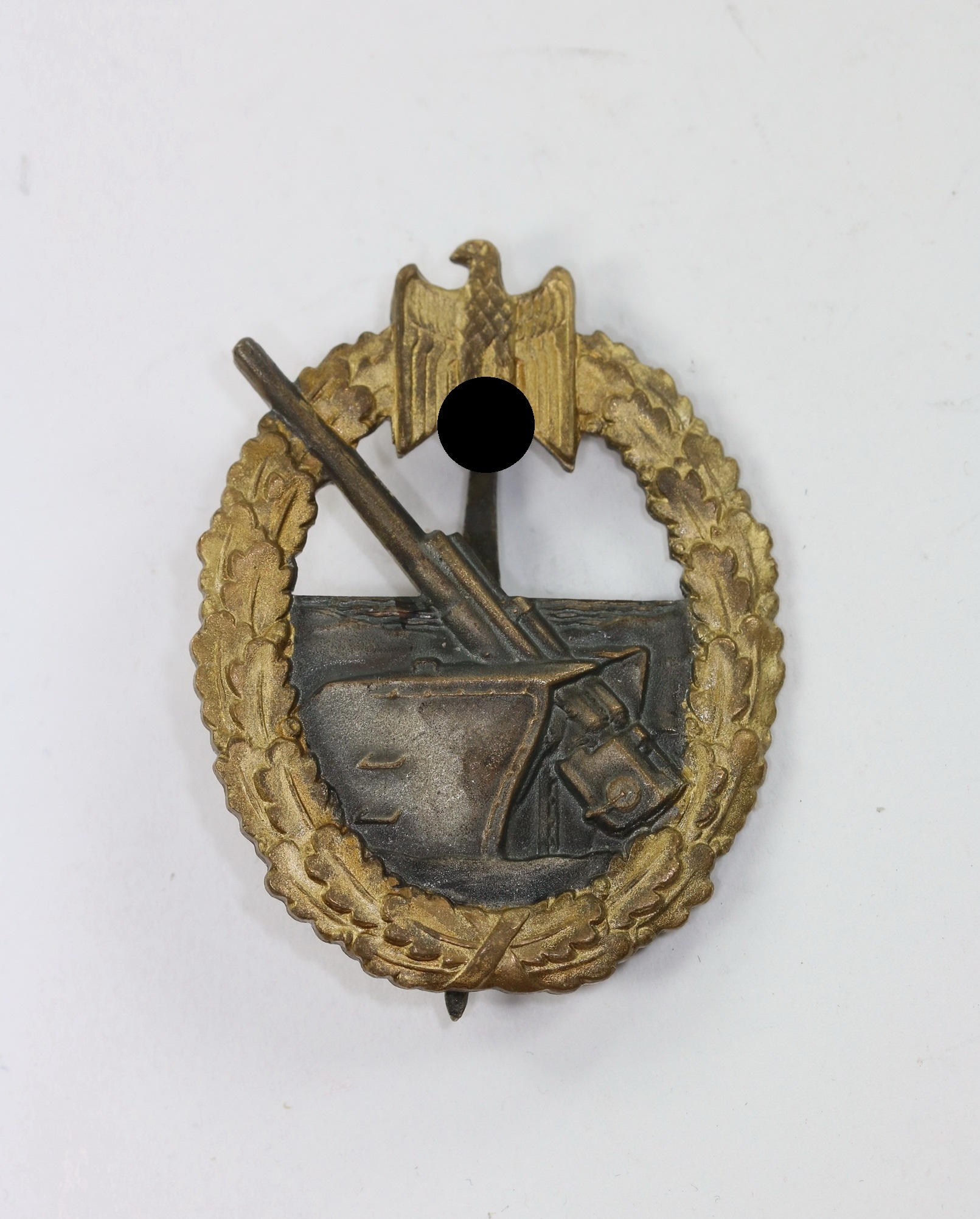 Buntmetall, sehr guter, leicht getragener Zustand. Der Kranz mit noch schöner Vergoldung. Das Geschütz mit fast vollständiger, dunkler Tönung. Rückseitig „FEC Otto Placzek Berlin“. Mit Hersteller „C.E. Juncker Berlin“, siehe GCA-Datenbank.