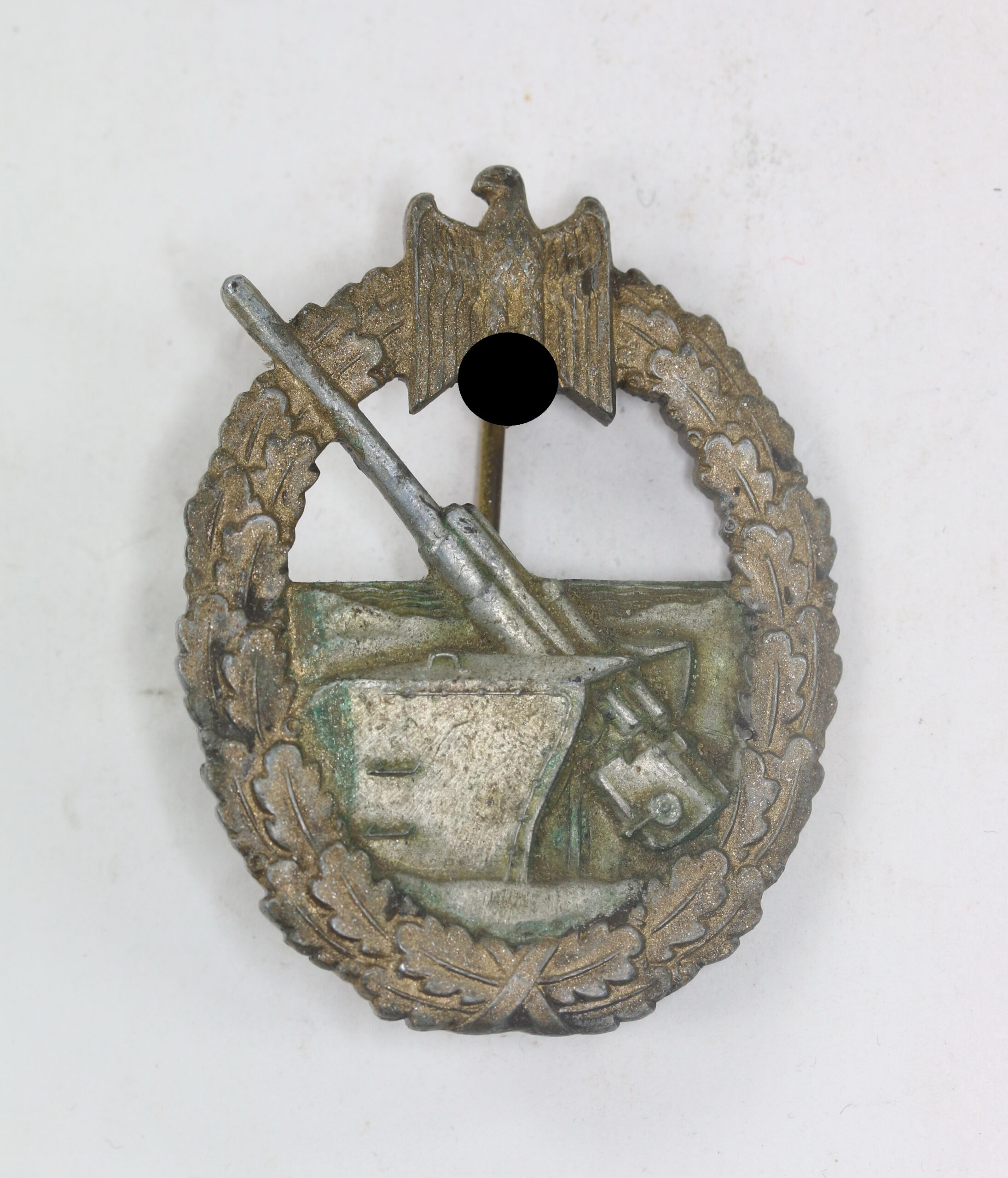 Zink, sehr guter, leicht getragener Zustand. Der Kranz mit Resten der Vergoldung. Ohne Hersteller, aber eine bekannte Variante der Firma Steinhauer & Lück, Lüdenscheid. Siehe GCA-Datenbank. Mit typischen eingequetschten Nadelsystem.