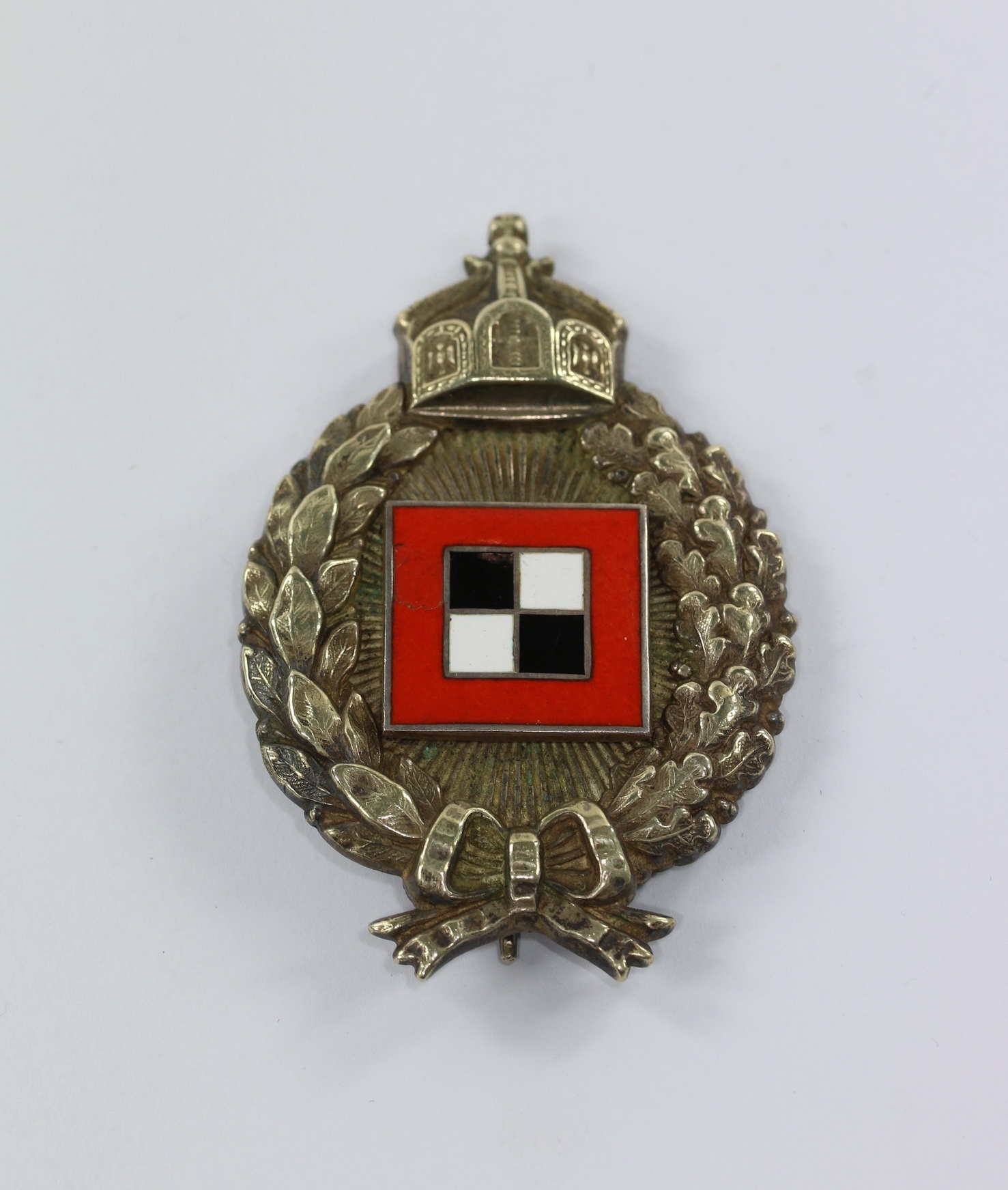 Buntmetall versilbert und hohl verbödet sehr guter, nur leicht getragener Zustand. Die Emaille mit einen leichten Abplatzer, aber ohne Ausbrüche. Sonst ohne Fehler. Mit schöner, unberührter Patina.
