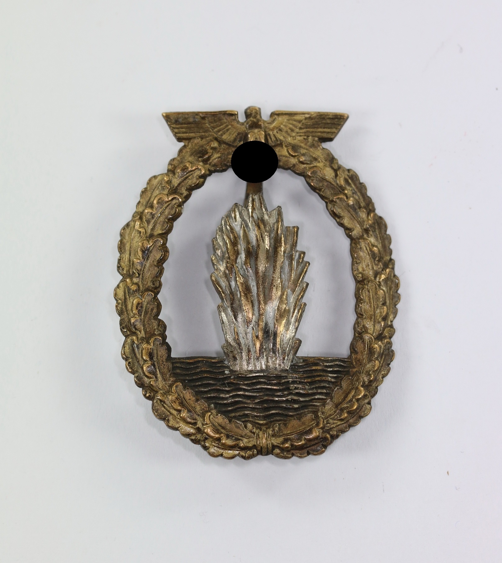 Buntmetall, sehr guter, leicht getragener Zustand. Ohne Hersteller, aber eine bekannte Variante der Firma C.E. Juncker, Berlin. Siehe Weber/Skora, Die Kriegsabzeichen der Kriegsmarine.