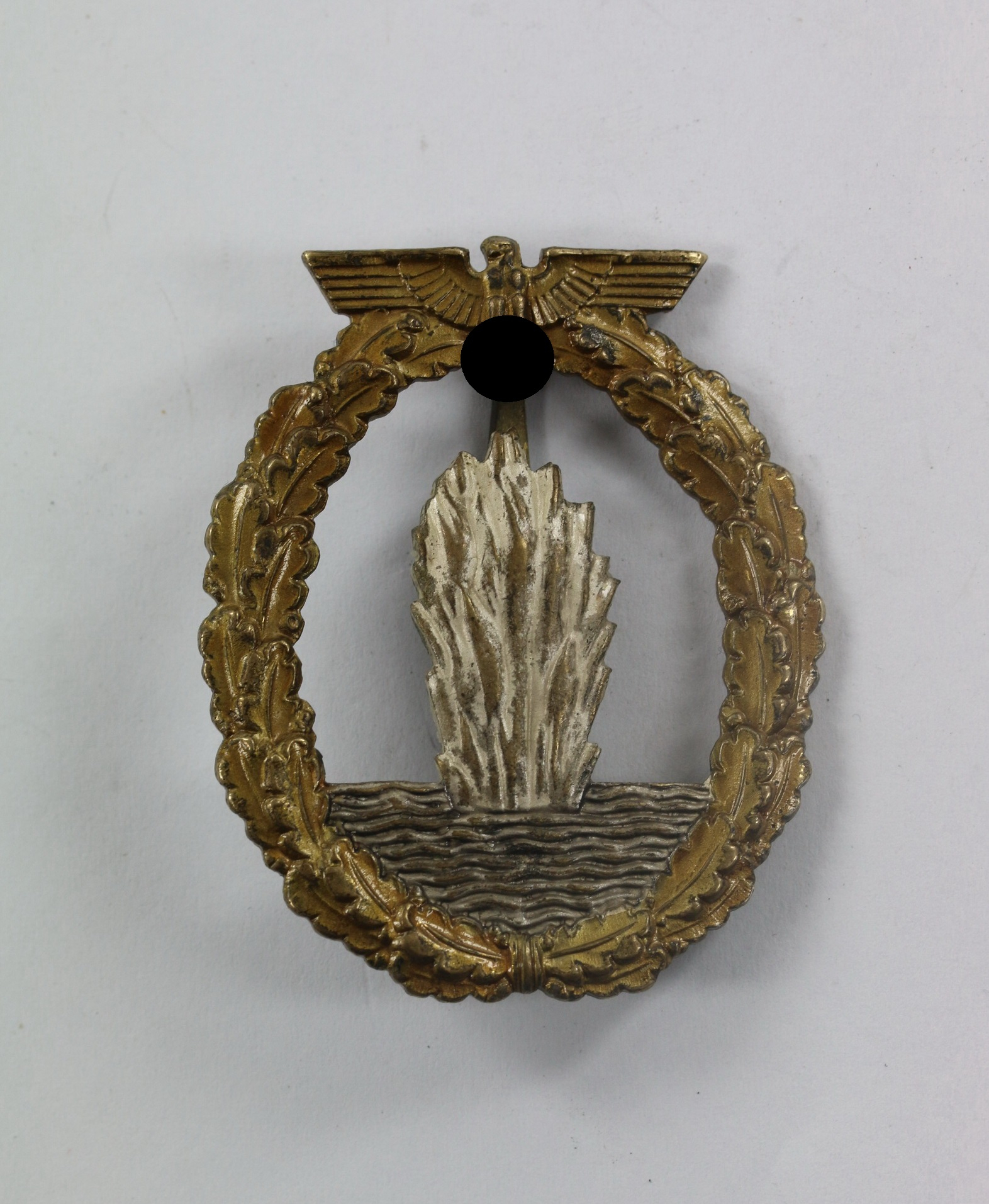Buntmetall, sehr guter, nur leicht getragener Zustand. Ohne Hersteller, aber eine bekannte Variante der Firma C.E. Juncker, Berlin. Siehe Weber/Skora, Die Kriegsabzeichen der Kriegsmarine (Variante 1).