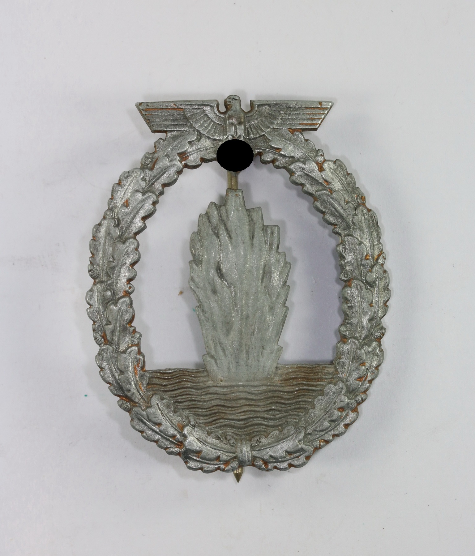Zink, sehr guter, leicht getragener Zustand. Mit Hersteller „l/18“ für die Firma B.H. Mayer, Pforzheim. Siehe Weber/Skora, Die Kriegsabzeichen der Kriegsmarine, S. 292/293, Typ 3.14. Mit abweichenden, seltenen Nadelsystem.