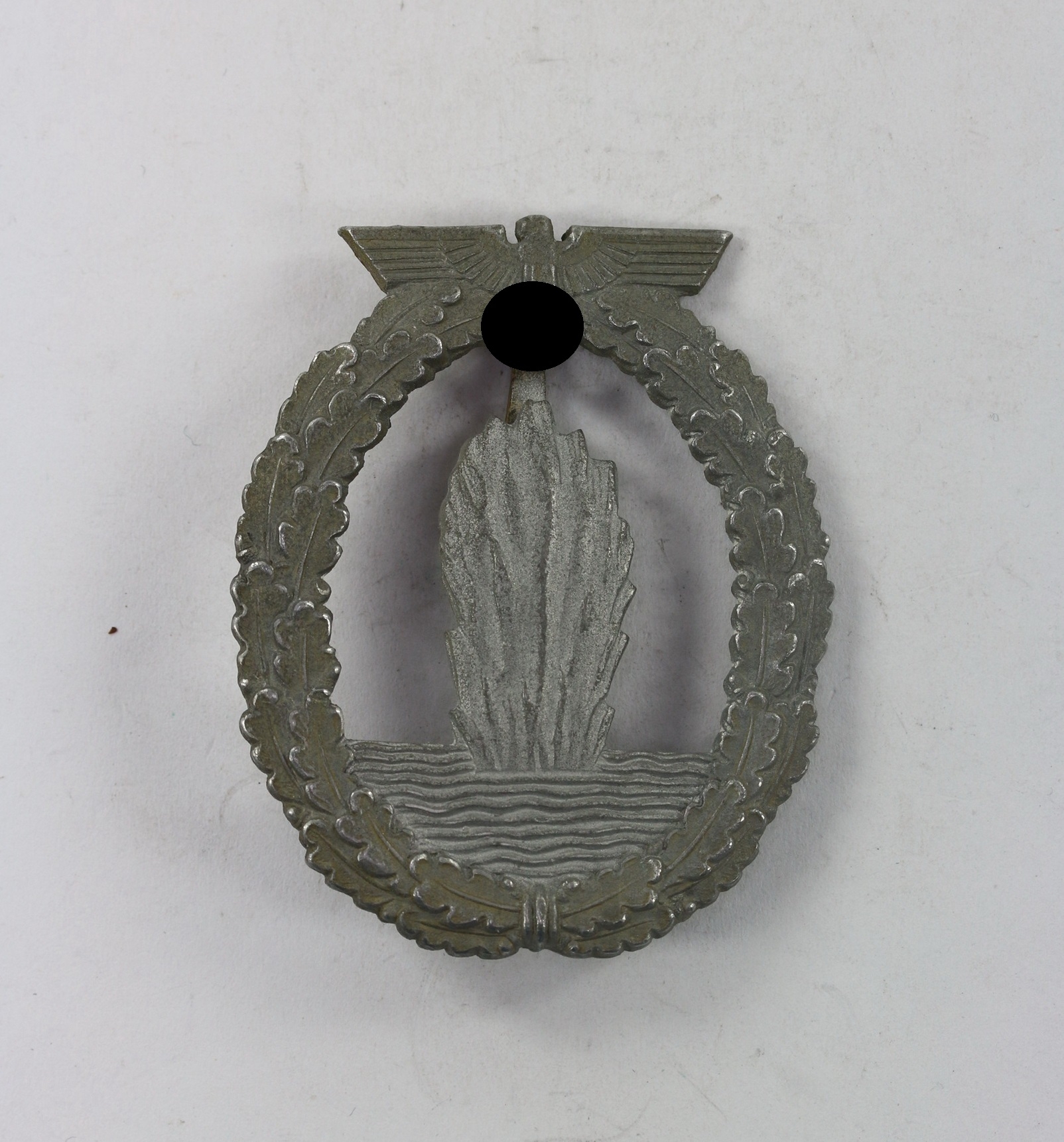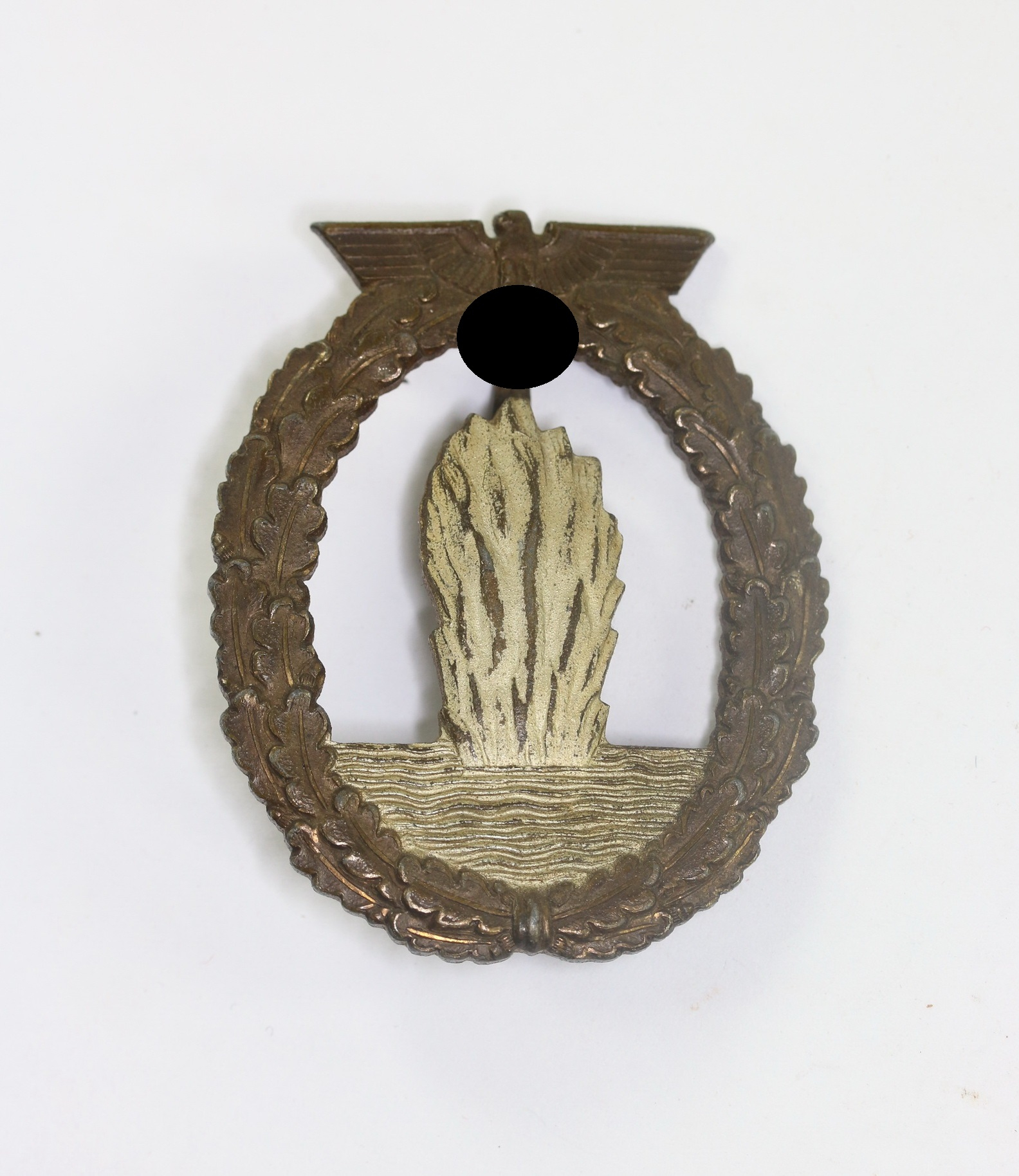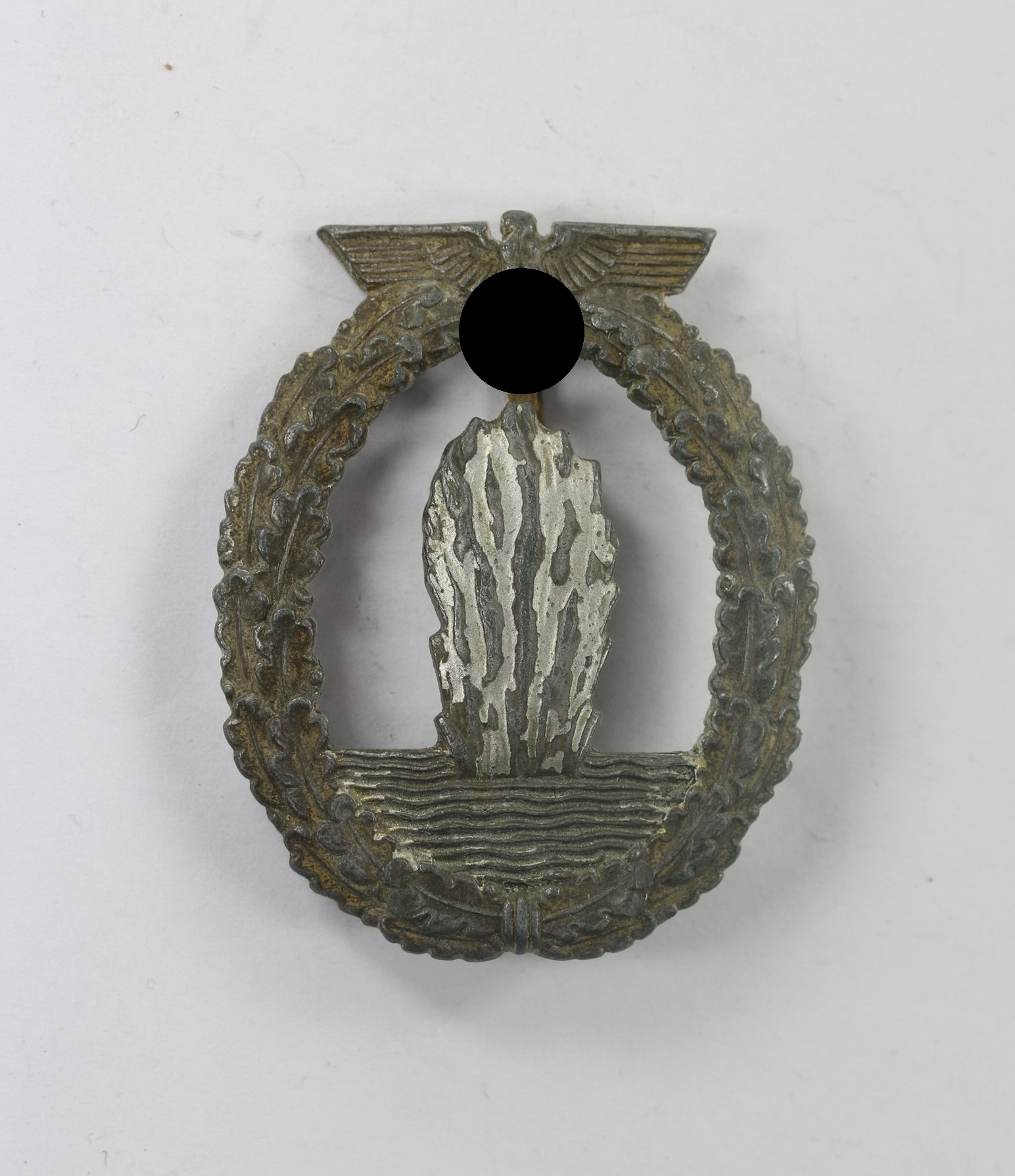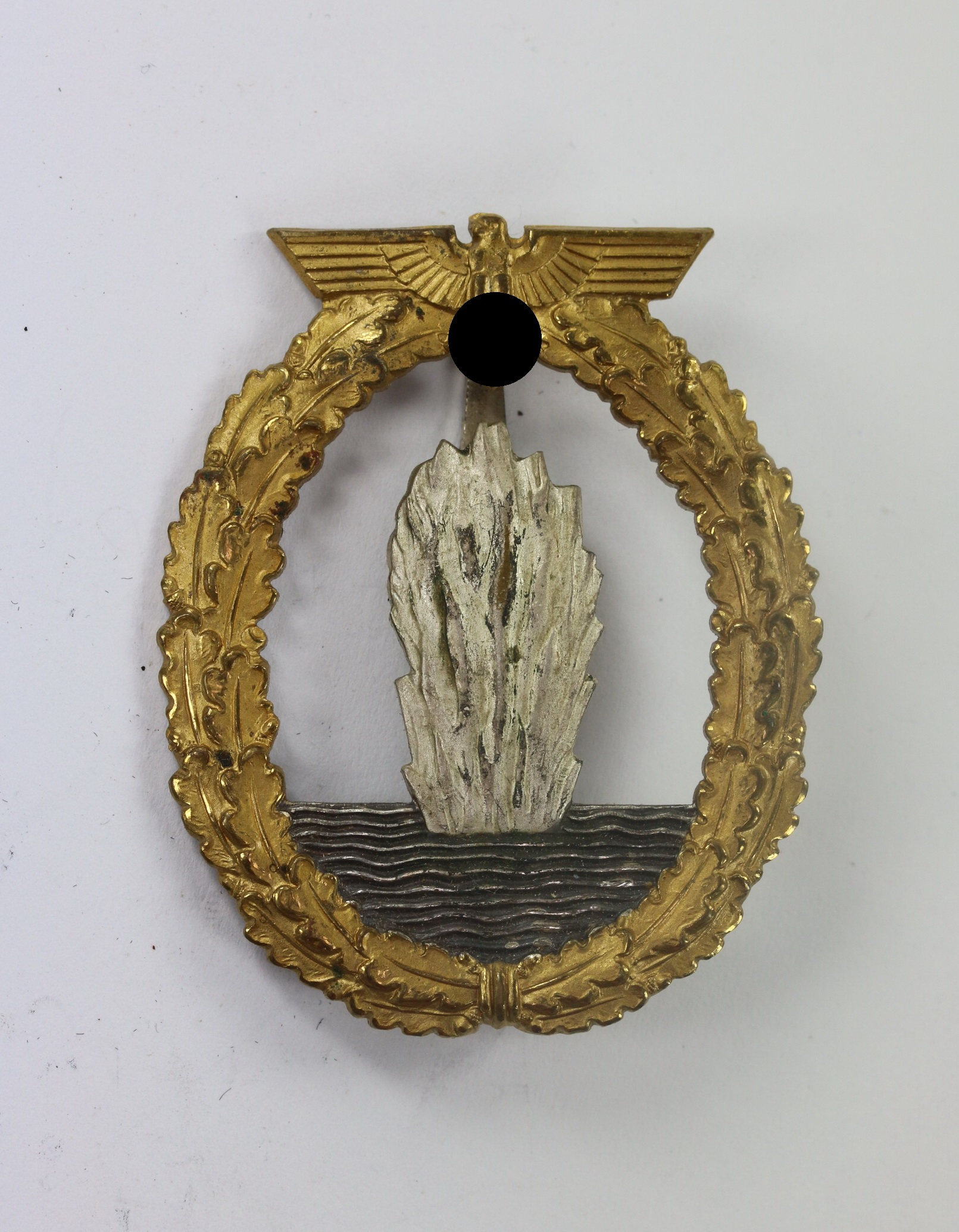 Buntmetall, sehr guter, nahe zu ungetragener Zustand. Der Kranz mit vollständiger Vergoldung, die Fontäne mit vollständiger, frostiger Versilberung. Das Wasser mit vollständiger, dunkler Tönung. Mit Hersteller „R.K.“ für die Firma Rudolf Karneth, Gablonz. Siehe GCA-Datenbank.